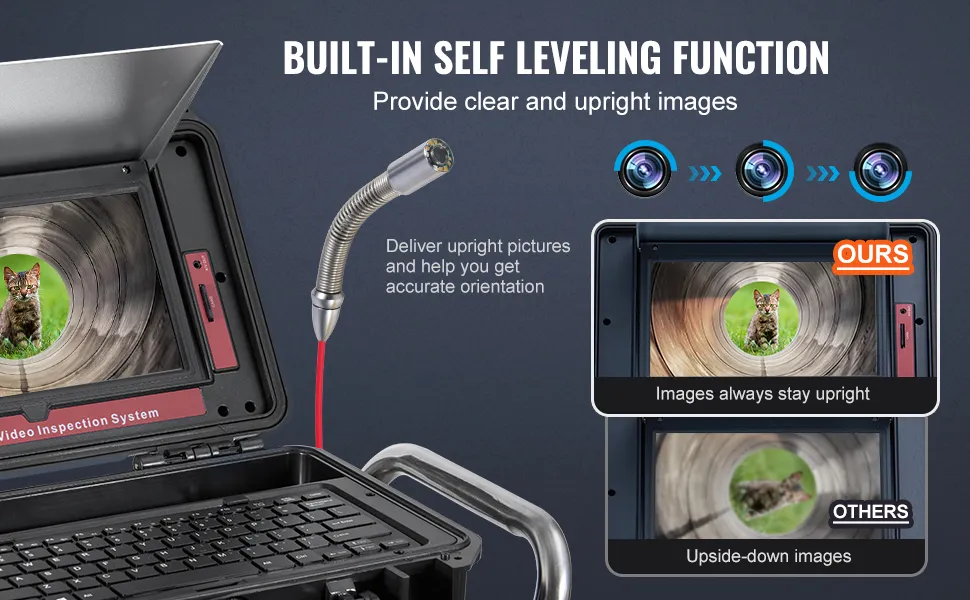 Diese Kanalinspektionskamera verfügt über eine integrierte Selbstnivellierungsfunktion, die eine aufrechte Bildanzeige gewährleistet. Unsere Kamera behält die Ansicht richtig bei und ermöglicht Ihnen die Inspektion mit präzisen Bildern und verbesserter Ausrichtung.