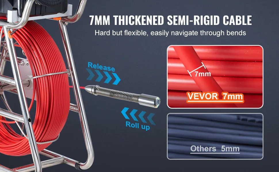 Robustes halbstarres Kabel: Unsere 328 Fuß / 100 m lange Rohrkamera verwendet ein verdicktes halbstarres Schlangenkabel mit einem Durchmesser von 0,28 Zoll (7 mm) aus robustem Fiberglas. Es zeichnet sich durch Passierbarkeit und Haltbarkeit aus und navigiert mühelos durch Biegungen und lange Rohre. Darüber hinaus behält es auch in dunklen, feuchten Bedingungen eine hervorragende Belastbarkeit und Haltbarkeit bei und lokalisiert Rohrverstopfungen effektiv, ohne zu brechen oder zu reißen.