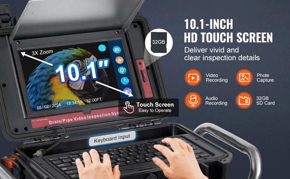 Die professionelle Sanitärkamera verfügt über einen 10,1-Zoll-HD-Touchscreen, der scharfe, klare Bilder für detaillierte Inspektionen liefert. Erfassen Sie mühelos jedes Detail mit Videoaufzeichnung, Fotoaufnahme und 3-fachem Digitalzoom.