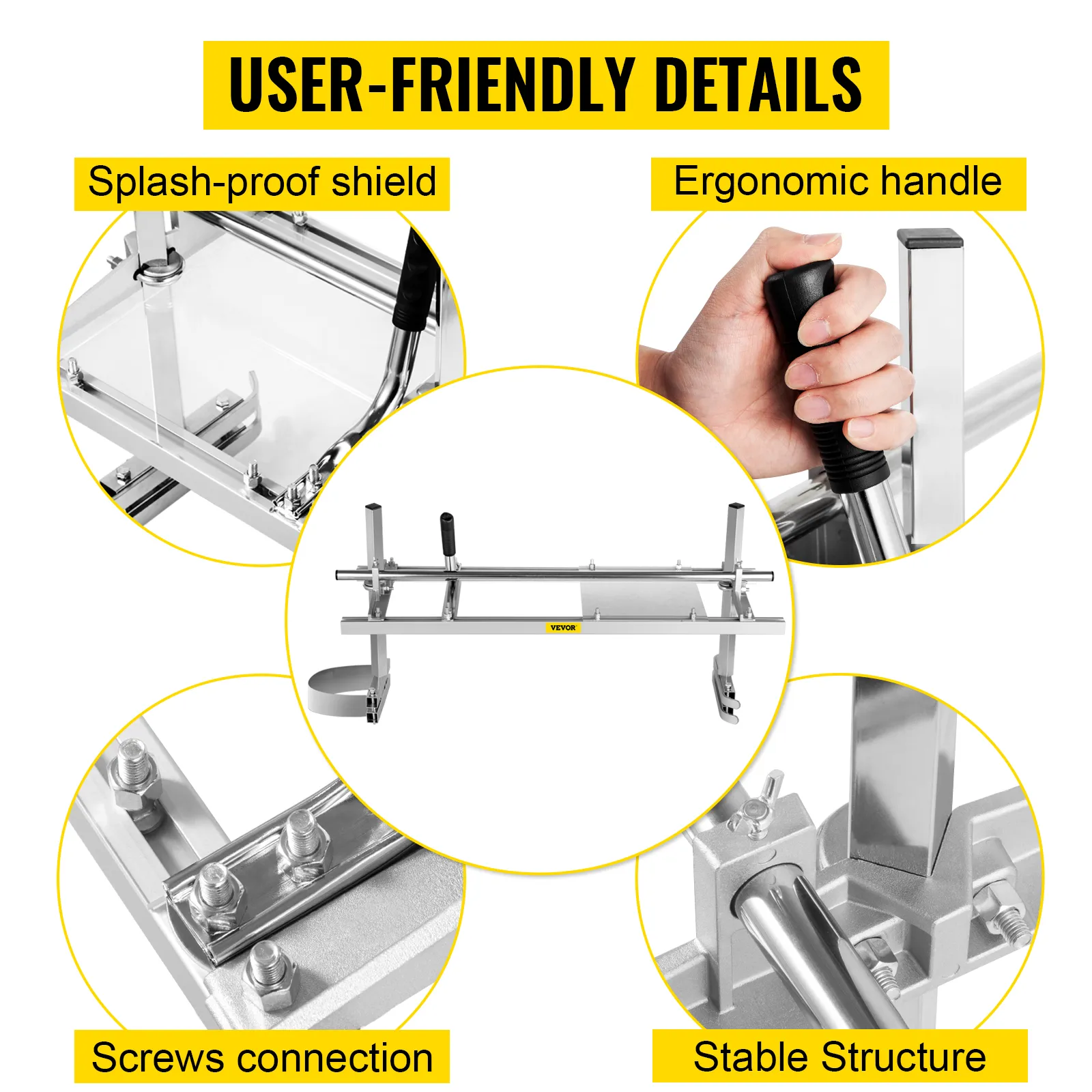 Das Kettensägewerk ist mit einem transparenten Spritzschutz und einem rutschfesten Griff ausgestattet, damit Sie es bequem bedienen können. Und die Schrauben sind sicher verbunden, um eine solide Struktur zu gewährleisten.