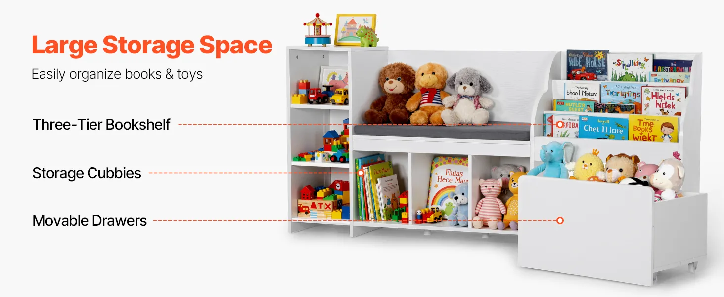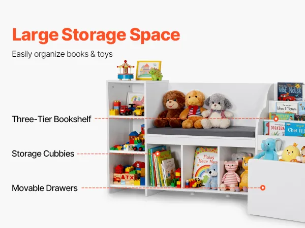 Diese Aufbewahrungsbank kombiniert ein Bücherregal, Ablagefächer und eine bewegliche Schublade und bietet so viel Stauraum. Spielzeug, Bücher und Kleidung lassen sich leicht sortieren, um das Zimmer ordentlich zu halten. Die verstellbaren Fächer ermöglichen es Ihnen, den Platz an verschiedene Gegenstände anzupassen.