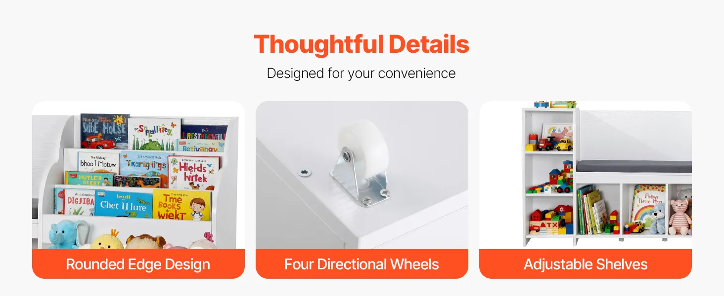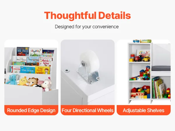 Die Spielzeugtruhe aus Holz ist mit drei Zahnrädern zur Höhenverstellung der Regale ausgestattet und erfüllt somit unterschiedliche Aufbewahrungsbedürfnisse. Die Schublade verfügt über vier Rollen, die ein einfaches Bewegen jederzeit ermöglichen, während das glatte und nicht scharfe Kantendesign Kratzer an den Händen während des Gebrauchs verhindert.