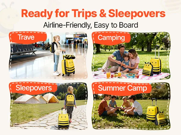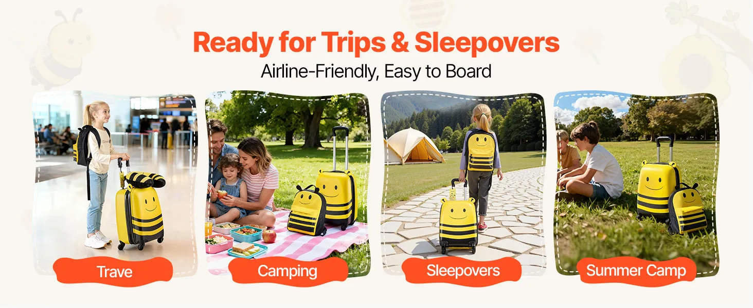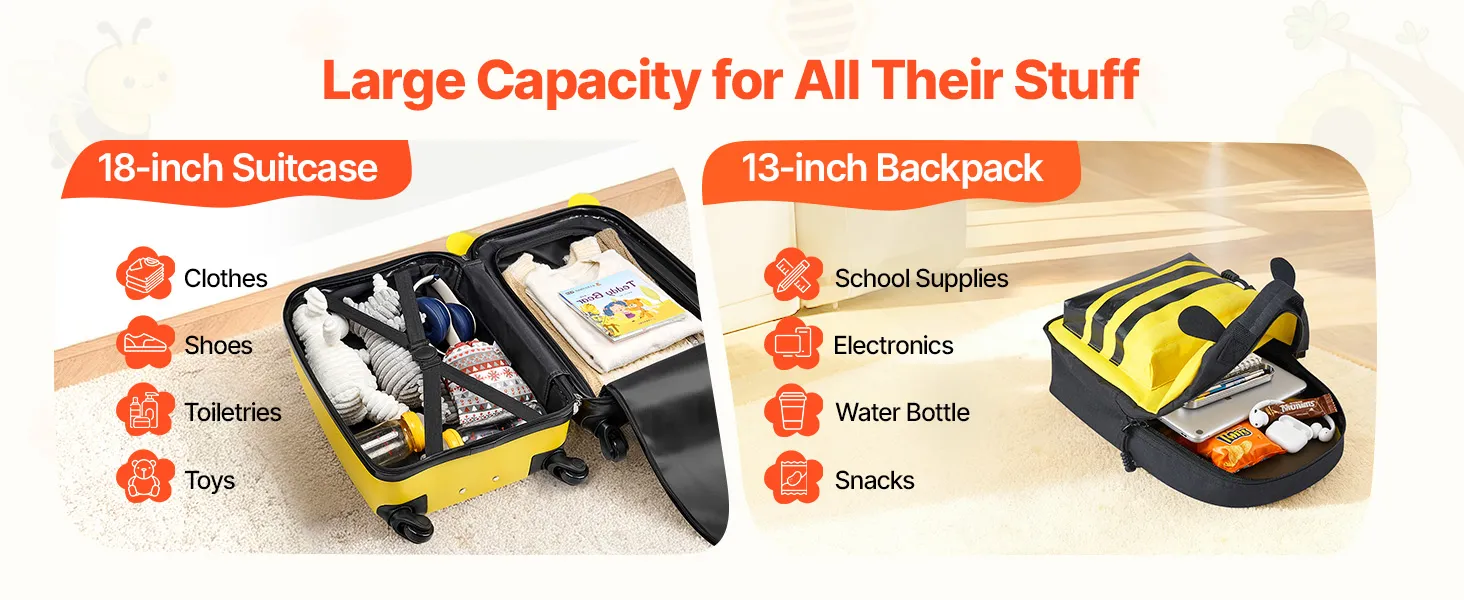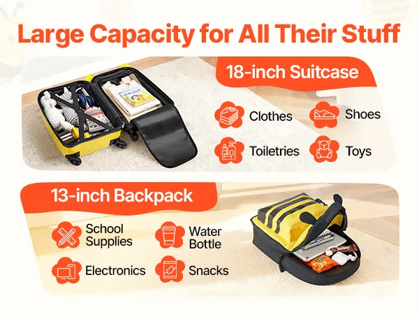 Der 457,2 mm große Kinder-Rollkoffer bietet Platz für Kleidung, Schuhe, Hygieneartikel und Spielzeug. Der Rucksack fasst Schulmaterial, elektronische Geräte, eine Trinkflasche und Snacks. So bleibt Ihr Kind auch auf Reisen und an anstrengenden Tagen ordentlich.