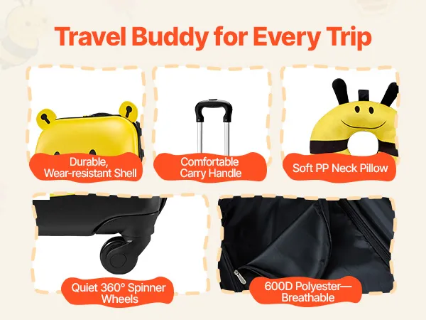 Der robuste Rollkoffer für Kinder ist mit atmungsaktivem 600D-Polyestergewebe ausgestattet. Das weiche Nackenkissen aus PP, die leisen Rollen und der komfortable Tragegriff sorgen für mehr Sicherheit und Komfort beim Reisen.