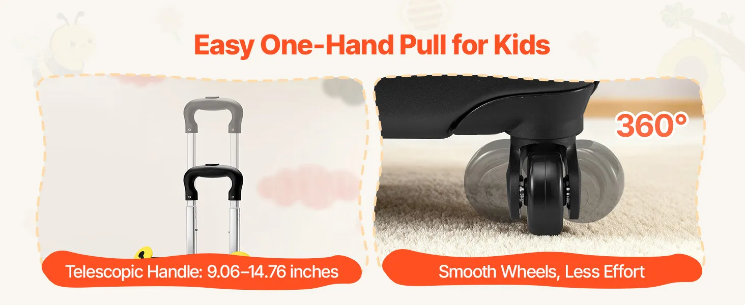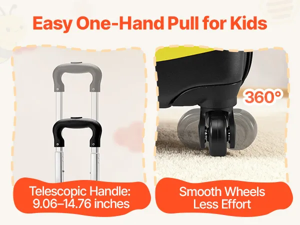 Der Teleskopgriff des Kinderkoffers lässt sich an das Wachstum des Kindes anpassen. Die Rollen gleiten mühelos, und dank des einfachen Öffnungs- und Schließmechanismus können Kinder ihren Koffer wie Profis selbst handhaben.