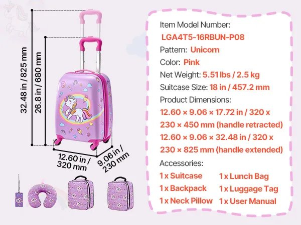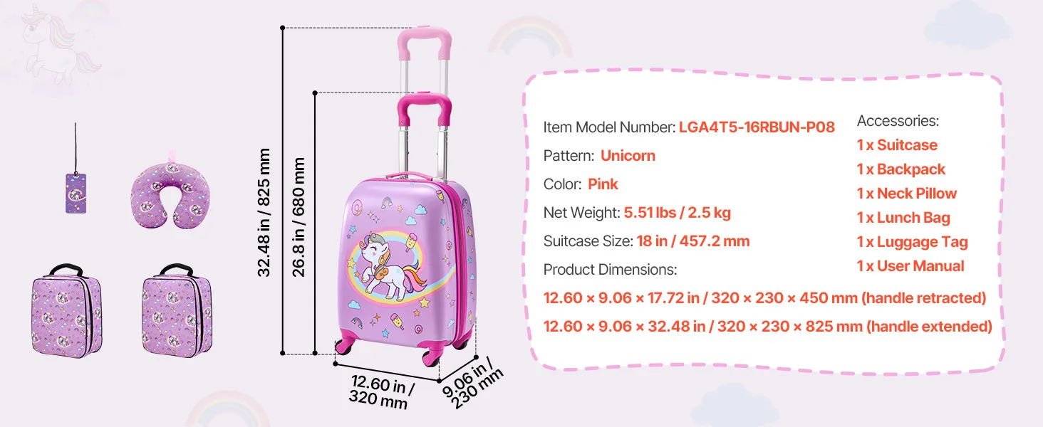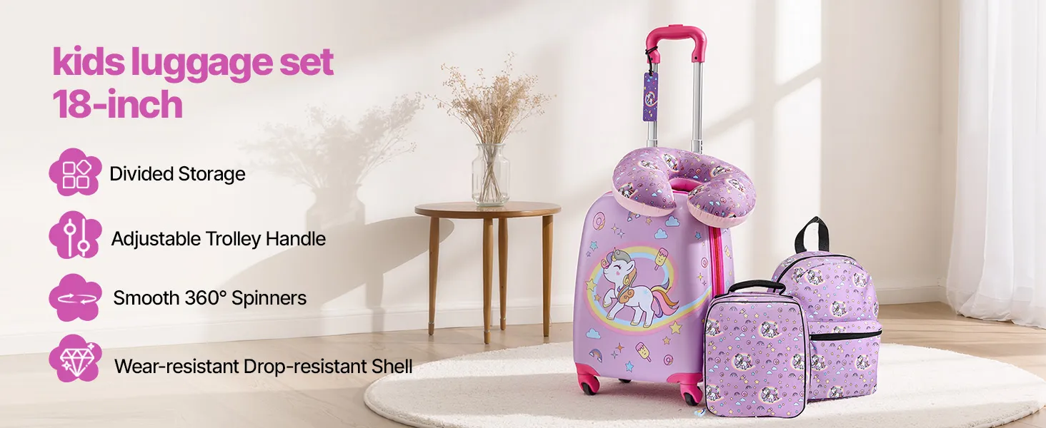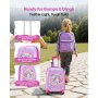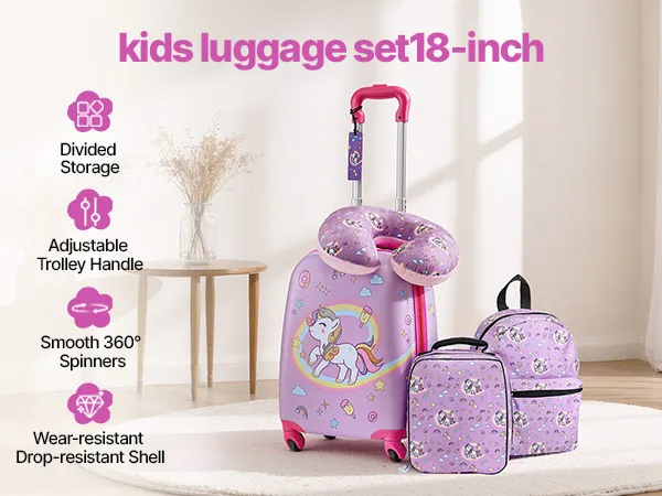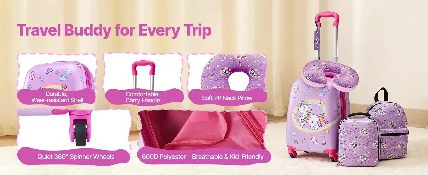 Von der Fluggesellschaft zugelassenes 5-teiliges Set: Dieser 457,2 mm große Kinderkoffer mit passendem Zubehör entspricht den Handgepäckbestimmungen der Fluggesellschaften und ist ideal für Alleinreisende. Er enthält einen Rucksack, ein Kissen, eine Lunchtasche und einen Gepäckanhänger