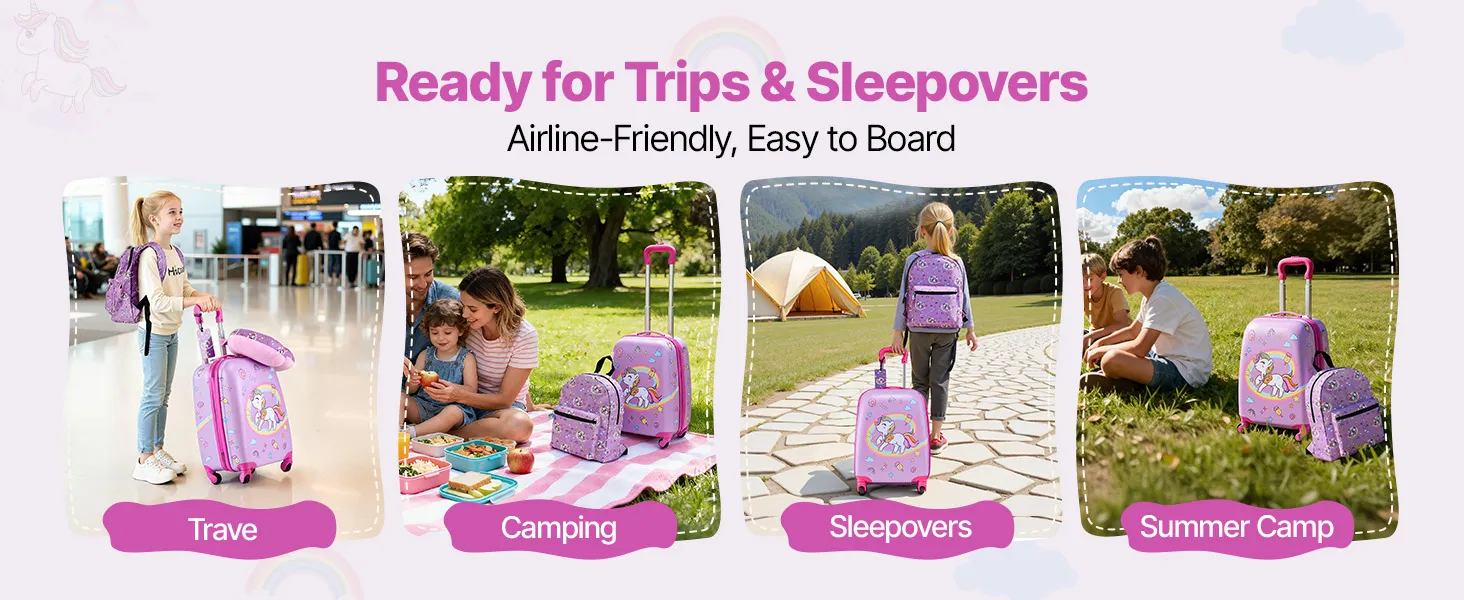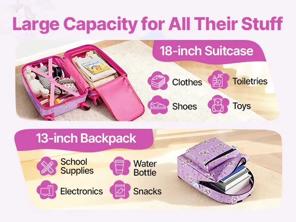 Der 457,2 mm große Kinder-Rollkoffer bietet Platz für Kleidung, Schuhe, Hygieneartikel und Spielzeug. Der Rucksack fasst Schulmaterial, elektronische Geräte, eine Trinkflasche und Snacks. So bleibt Ihr Kind auch auf Reisen und an anstrengenden Tagen ordentlich.