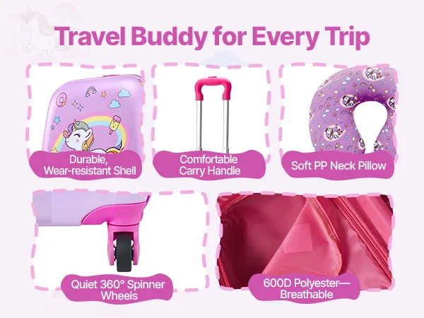 Der robuste Rollkoffer für Kinder ist mit atmungsaktivem 600D-Polyestergewebe ausgestattet. Das weiche Nackenkissen aus PP, die leisen Rollen und der komfortable Tragegriff sorgen für mehr Sicherheit und Komfort beim Reisen.
