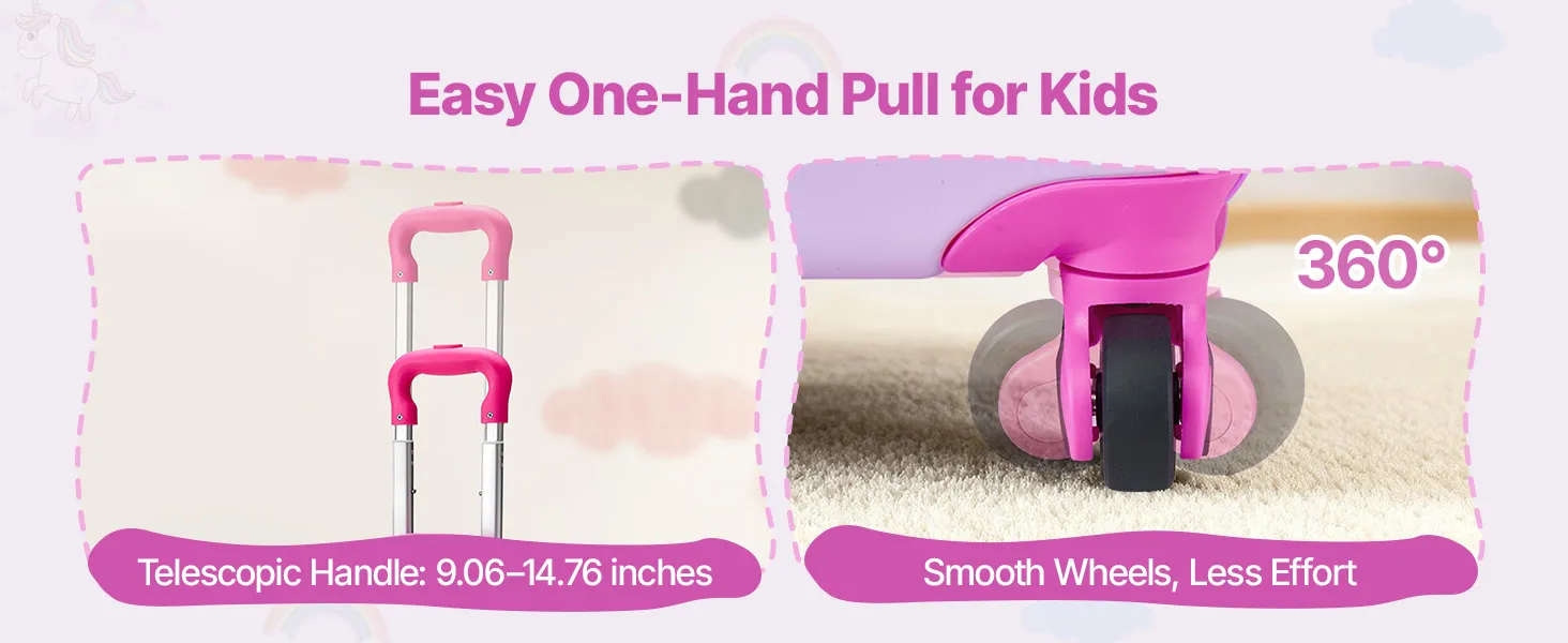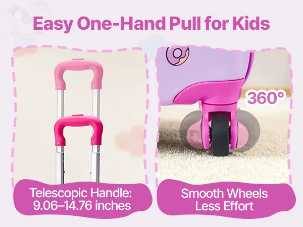 Der Teleskopgriff des Kinderkoffers lässt sich an das Wachstum des Kindes anpassen. Die Rollen gleiten mühelos, und dank des einfachen Öffnungs- und Schließmechanismus können Kinder ihren Koffer wie Profis selbst handhaben.