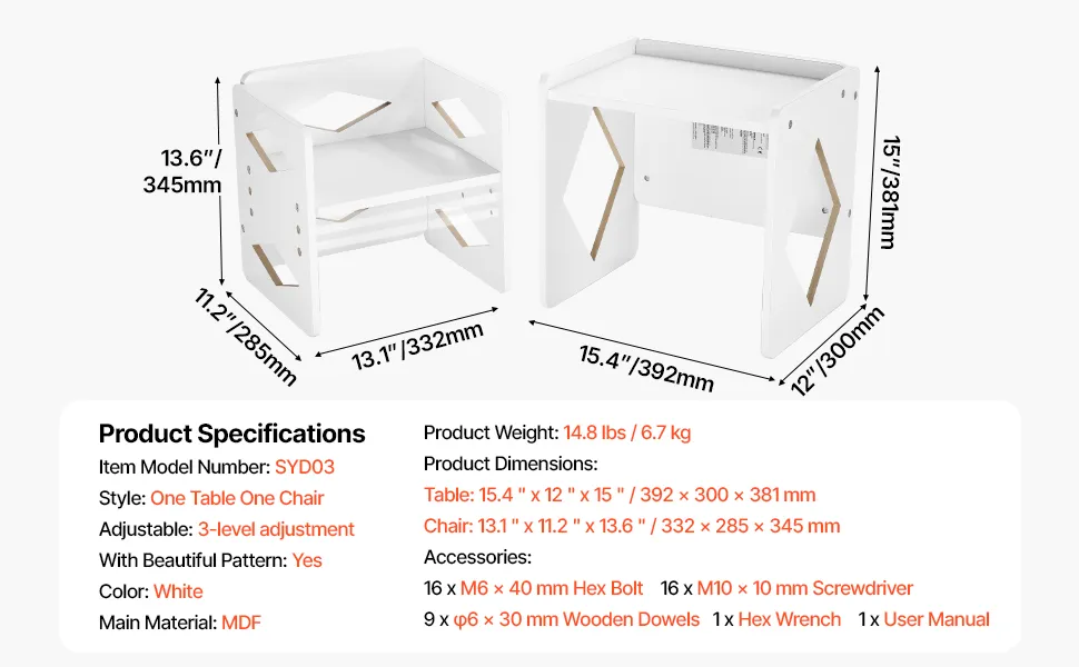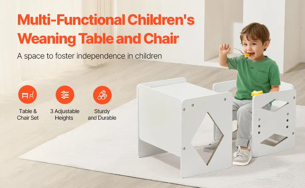 Dieses Set aus Tisch und Stuhl für die Entwöhnung mit kreativem Muster bietet drei Höheneinstellungen (133 mm, 168 mm, 204 mm). Sie sind aus strapazierfähigem MDF mit glatten Kanten für mehr Sicherheit gefertigt und verfügen über Griffe zum einfachen Bewegen.
