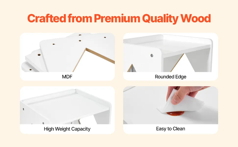 Dieses Montessori-Möbel ist aus strapazierfähigem MDF gefertigt und verfügt über abgerundete Ecken, um das Verletzungsrisiko zu verringern. Seine hohe Belastbarkeit und die leicht zu reinigende Oberfläche sorgen für Komfort, Sicherheit und Stabilität für Ihr Kind.