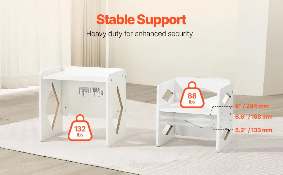 Unser Montessori-Set aus Tisch und Stuhl bietet eine außergewöhnliche Tragfähigkeit, wobei der Tisch bis zu 60 kg und der Stuhl bis zu 40 kg tragen kann. So ist für die Kinder während der Benutzung Stabilität und Sicherheit gewährleistet.