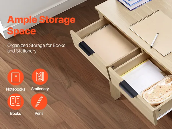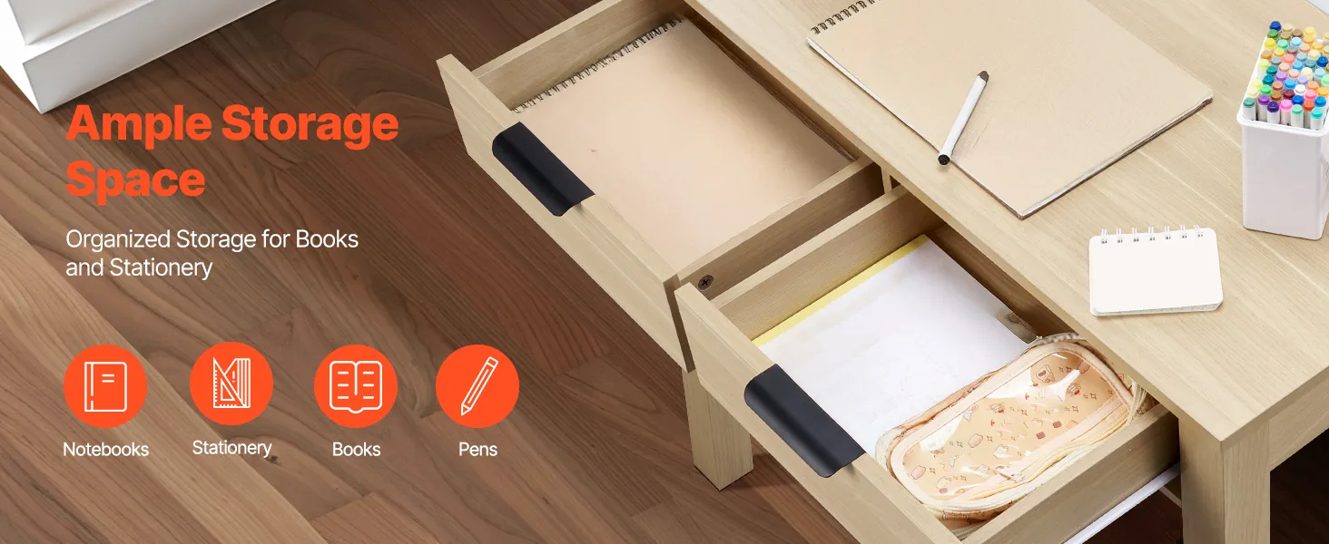 Praktische Aufbewahrung: Der Kinderschreibtisch ist mit zwei großen Schubladen ausgestattet, ideal zur Aufbewahrung von Büchern, Dokumenten und Schreibwaren. Diese Schubladen helfen Kindern, gute Organisationsgewohnheiten zu entwickeln und den Lernbereich ordentlich zu halten