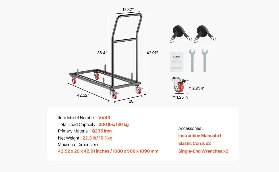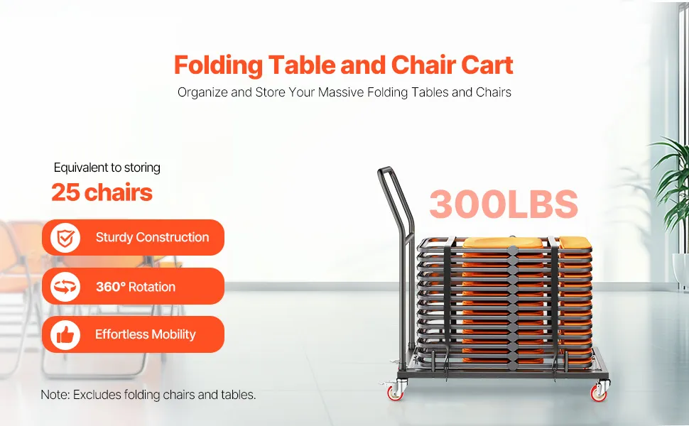 Produktabmessungen: Mit einer Länge von 42,5 Zoll / 1080 mm, einer Breite von 20 Zoll / 508 mm und einer Höhe von 42,9 Zoll / 1090 mm hat unser Klappstuhlwagen eine maximale Tragfähigkeit von 300 lbs / 136 kg. Damit können Sie bis zu 25 Stühle verstauen (Hinweis: Klappstühle nicht im Lieferumfang enthalten), was Flexibilität und platzsparenden Komfort bietet.