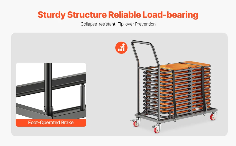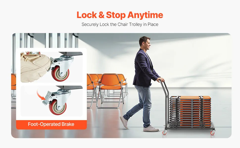 Dieser Stuhlwagen wird mit einem kompletten Satz vielseitiger Zubehörteile geliefert, darunter verstellbare Gurte und leicht zu bedienende Bremsräder, die einen reibungslosen Transport und eine sichere Lagerung Ihrer Stühle gewährleisten.