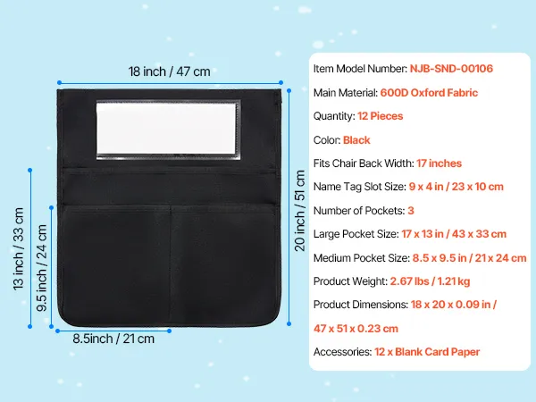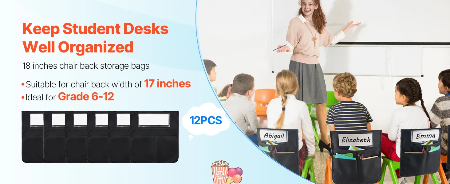 12-teiliges Stuhllehnentaschen-Set: Enthält 12 schwarze Stuhllehnentaschen mit Namensschildern, ideal für die Klassen 6 bis 12. Jede Tasche passt für 43,2 cm breite Stuhllehnen – ideal für die Organisation von Schreibtischen und um alles griffbereit zu haben