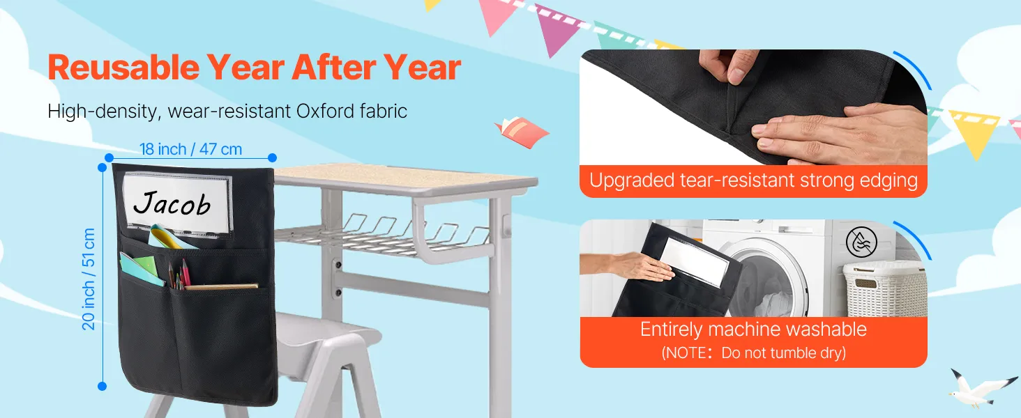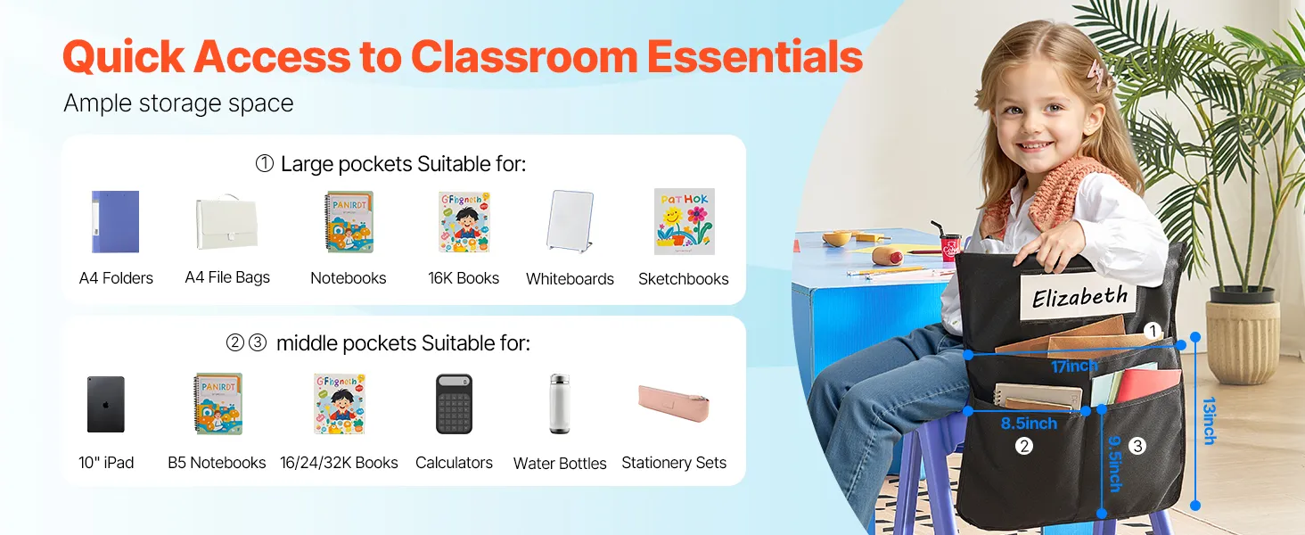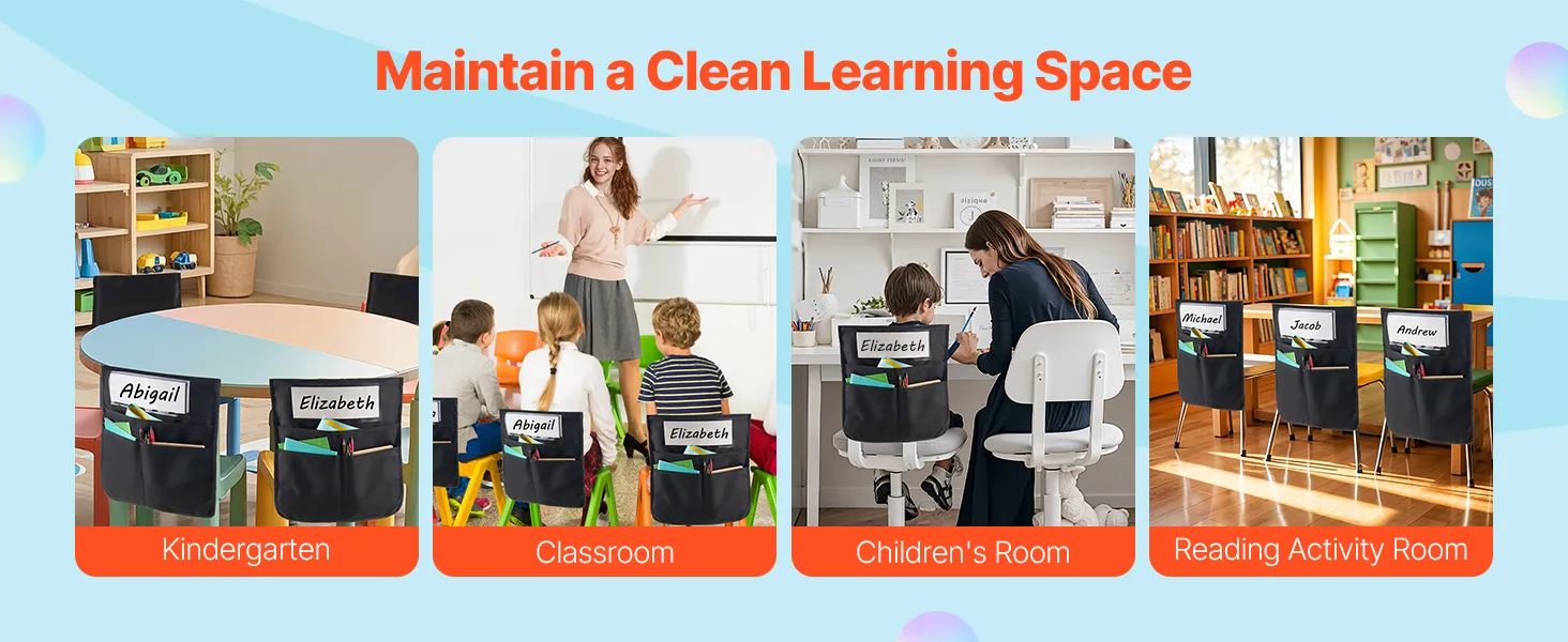 Vielseitige Optionen: Erhältlich in verschiedenen Größen und Mengen, passend für Ihren Unterrichtsbedarf. Der Stuhlrücken-Organizer eignet sich ideal als Geschenk zum Schulanfang, sorgt für Ordnung auf den Schreibtischen und schafft eine effizientere Lernumgebung