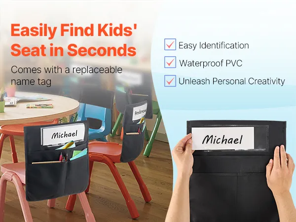VEVOR Klassenzimmerstuhltasche, 12er-Pack, 47x51 cm, Rückenlehnentasche mit Namensschild, Stuhlrücken-Organizer für Kinder im Klassenzimmer, Kindergarten, in der Schule & zu Hause, Schwarz