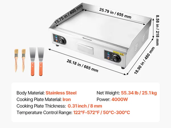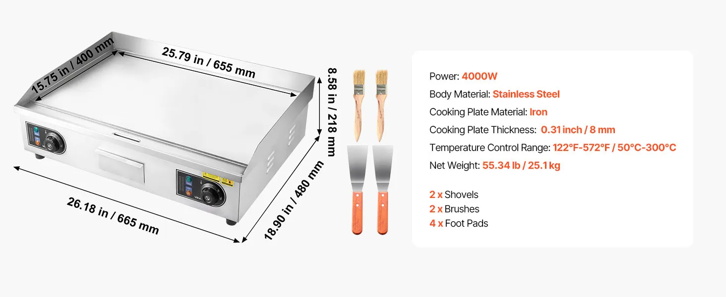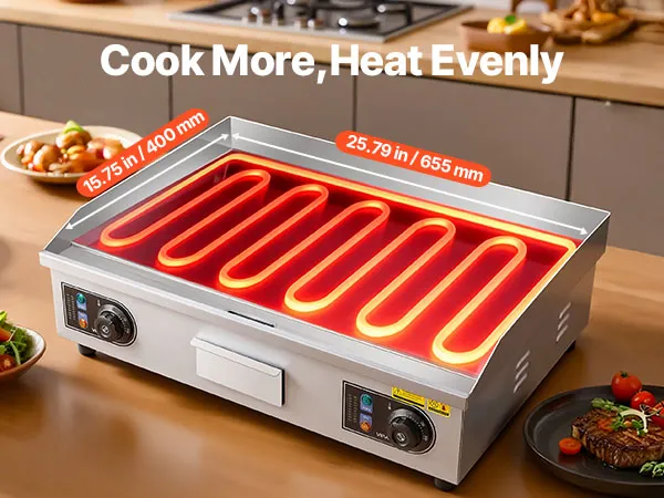 Leistungsstarke & große Grillplatte: Diese 4000-W-Elektrogrillplatte für den gewerblichen Einsatz verfügt über eine 655 x 400 mm (25,79 x 15,75 Zoll) große Grillfläche und eine 8 mm (0,31 Zoll) dicke Eisenplatte. Die gleichmäßige Wärmeverteilung sorgt für optimales Garen und ermöglicht die Zubereitung größerer Mengen an Speisen gleichzeitig