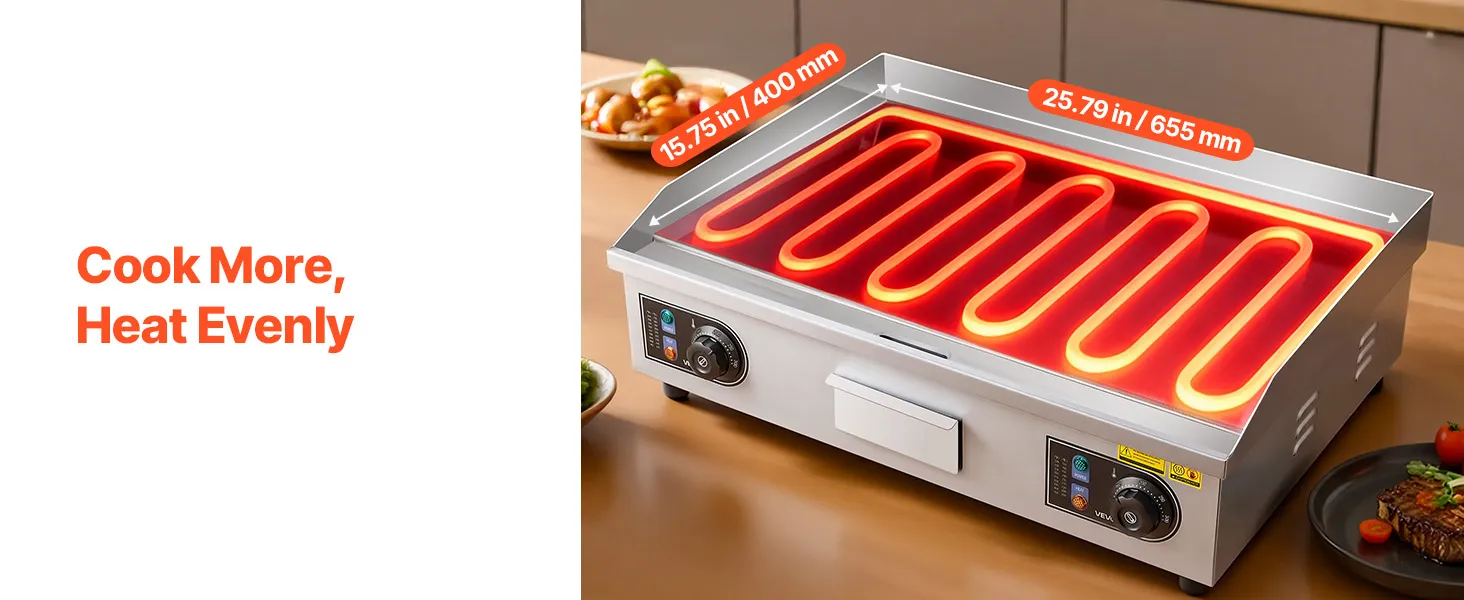 Mit unserer 4000-Watt-Elektrogrillplatte für den gewerblichen Einsatz garen Sie mehr in kürzerer Zeit. Gleichmäßige Hitze und präzise Temperaturregelung sorgen für perfekt gegarte Pfannkuchen, Steaks, Hähnchen und vieles mehr. Dank des reinigungsfreundlichen Designs ist die Reinigung schnell und einfach.