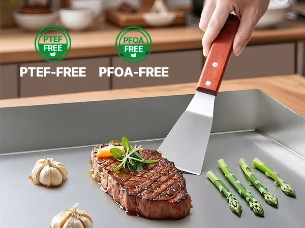 Genießen Sie unbeschwertes Essen: Der hochwertige Edelstahlkorpus und die PFOA/PTFE-freie Kochfläche aus Gusseisen der Grillplatte sorgen für lange Haltbarkeit und ein gesünderes Kocherlebnis