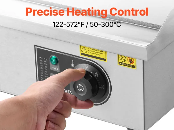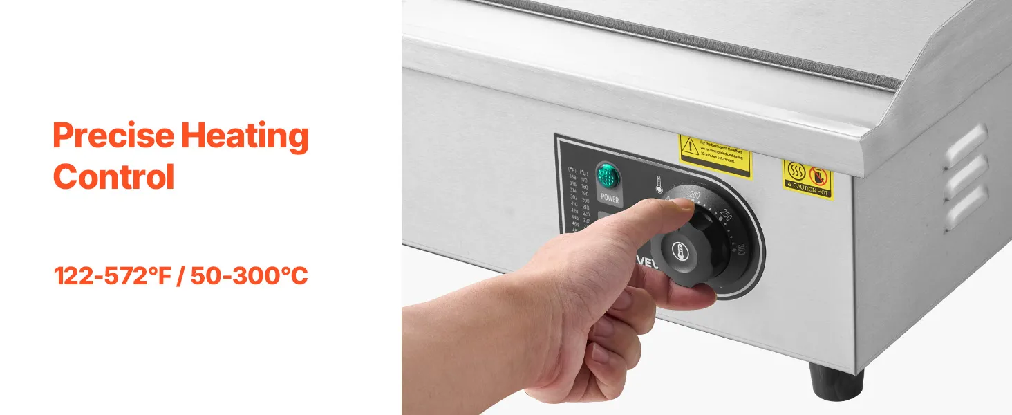 Präzise Heizregelung: Dank der einstellbaren Temperatur von 50 °C bis 300 °C (122 °F bis 570 °F) gelingt Ihnen mit dieser elektrischen Edelstahl-Grillplatte die ideale Hitze für Pfannkuchen, Steaks, Hähnchen und vieles mehr