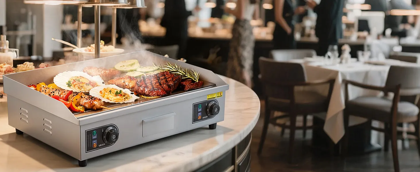 Für vielfältige Speisen & Anlässe: Dieser Profigrill eignet sich ideal für den privaten oder gewerblichen Gebrauch, z. B. in Restaurants, Geschäften und Imbissständen. Er ist geeignet für Pfannkuchen, Speck, Käse, Omeletts, Pizza, Steaks und Burger