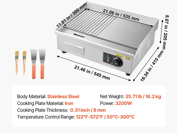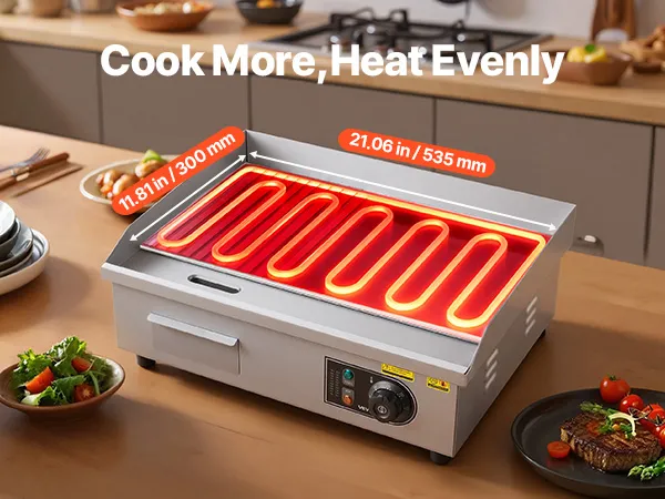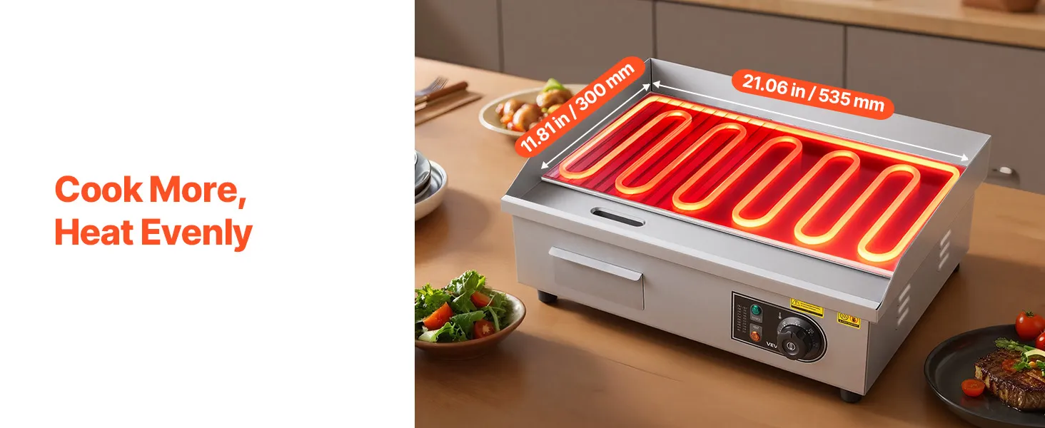 • Leistungsstarke & große Grillplatte: Diese 3200 W Elektrogrillplatte für den gewerblichen Einsatz verfügt über eine 21,06x11,81 Zoll (535x300 mm) große Grillfläche und eine 0,31 Zoll (8 mm) dicke Eisenplatte. Die gleichmäßige Hitzeverteilung sorgt für optimales Garen und ermöglicht die Zubereitung größerer Mengen an Speisen gleichzeitig