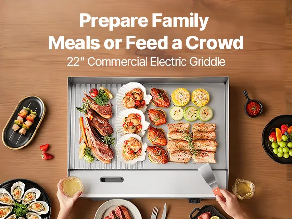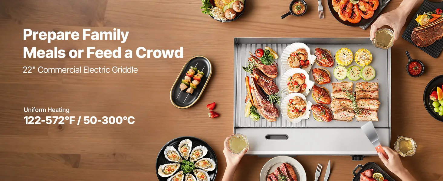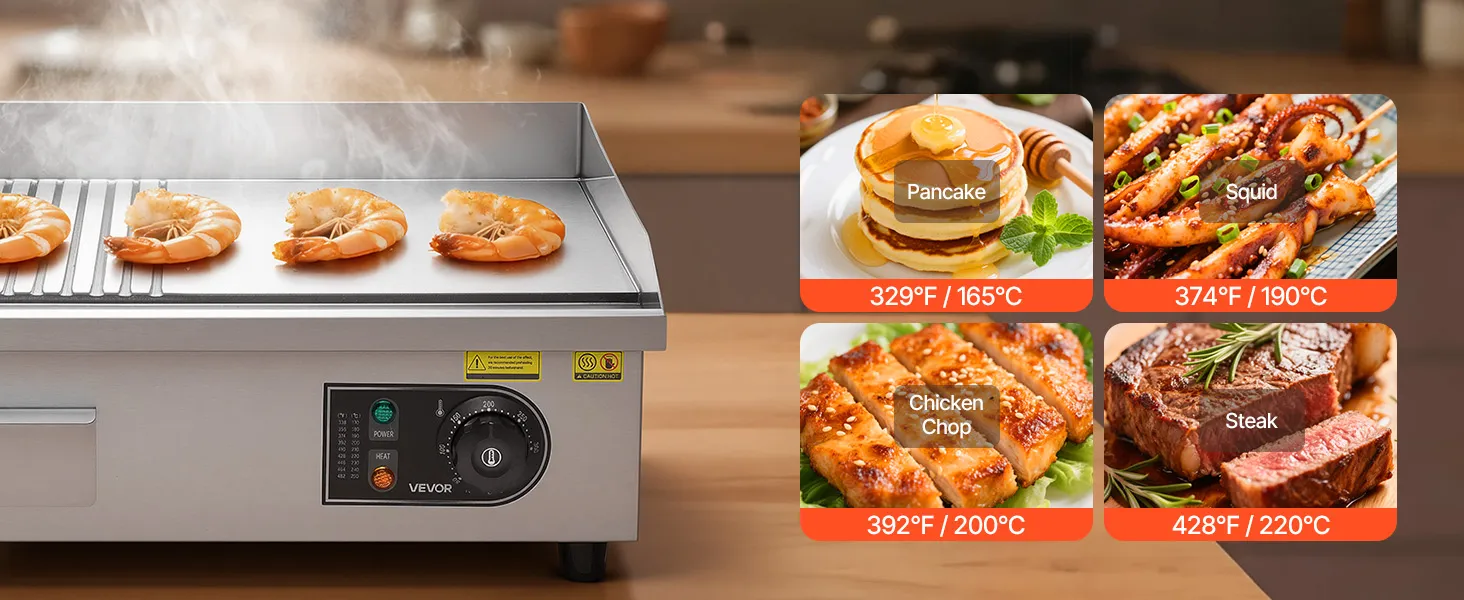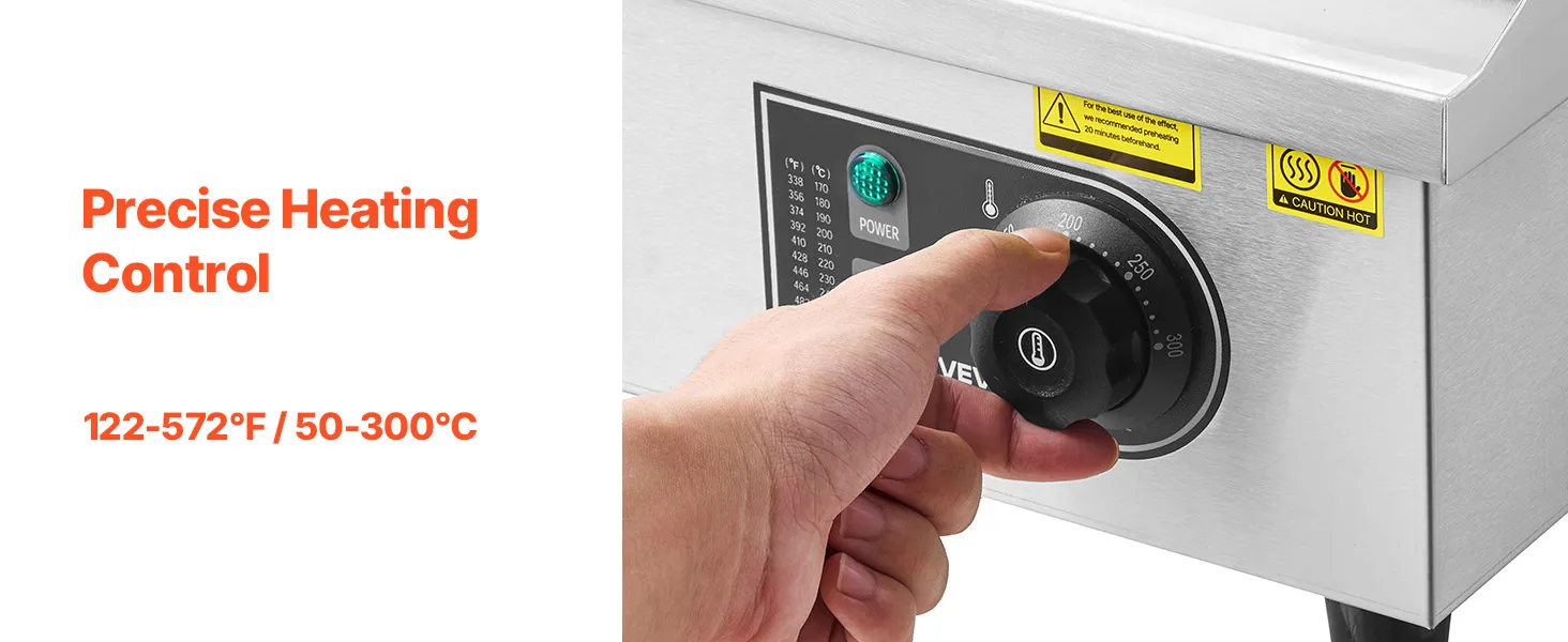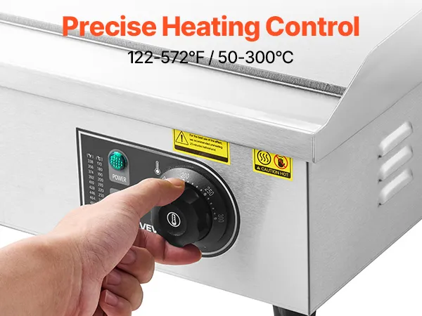 • Präzise Heizregelung: Dank der einstellbaren Temperatur von 122 °F bis 570 °F (50 °C bis 300 °C) gelingt Ihnen mit dieser elektrischen Edelstahl-Grillplatte die ideale Hitze für Pfannkuchen, Steaks, Hähnchen und vieles mehr