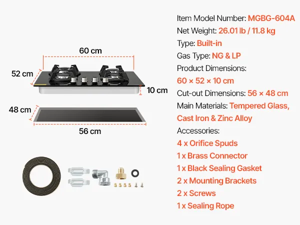 Das 60 cm Gaskochfeld verfügt über 4 Brenner, eine Umstellung von Erdgas auf Flüssiggas, eine robuste Oberfläche aus gehärtetem Glas und abnehmbare Gusseisenroste, die eine einfache Reinigung ermöglichen und Ihnen dabei helfen, Ihre täglichen Kochaufgaben mit gleichbleibender Leistung zu bewältigen.