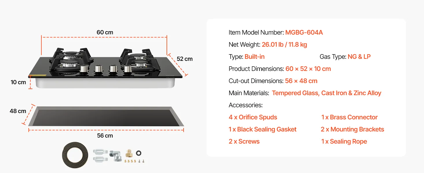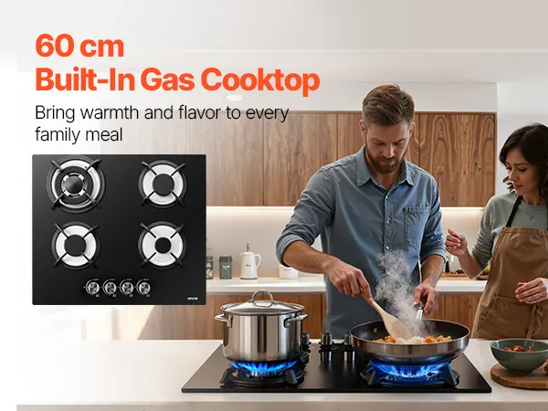 VEVOR Gaskochfeld 60 cm, Einbau-Kochfeld (4 Zonen) aus Gehärtetem Glas, Umrüstbar auf Flüssiggas (LPG) und Erdgas (NG), Kochfeld mit Thermoelement-Überwachung zum Anbraten Schmoren Kochen