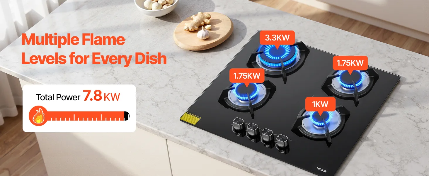 Verfügt über vier versiegelte Brenner mit einer Gesamtleistung von 7,8 kW, darunter ein 3,3 kW BTU Doppelringbrenner, der für gleichmäßige hohe Hitze oder eine sanfte niedrige Flamme sorgt und Ihnen so eine sichere Kontrolle über die Zubereitung verschiedenster Gerichte ermöglicht.