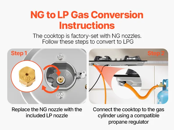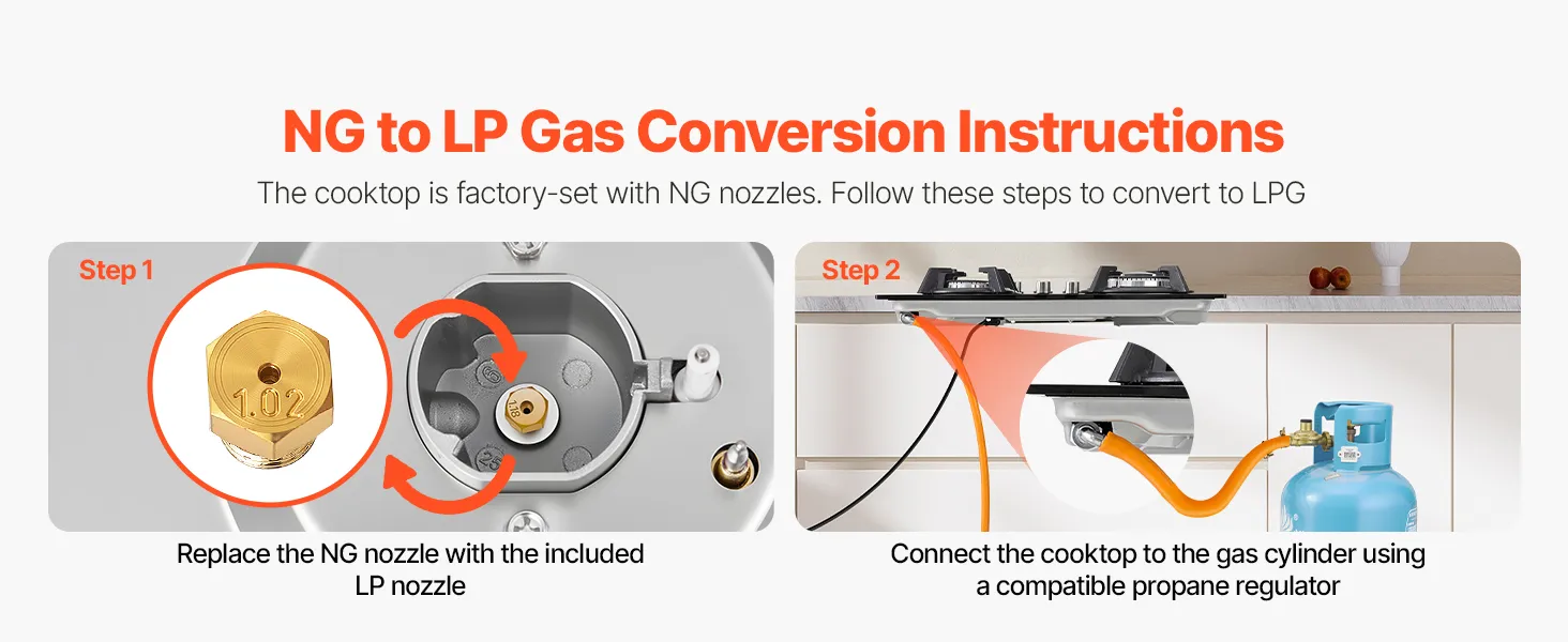 Geeignet für Zweistoffbetrieb: Dank der elektronischen Zündung, die sofort zündet, reagiert dieser Herd reibungslos im täglichen Gebrauch. Er ist für Erdgas voreingestellt und enthält LPG-Düsen, sodass Sie die Brennstoffart einfach wechseln und die Installation in verschiedenen Küchen unkompliziert gestalten können