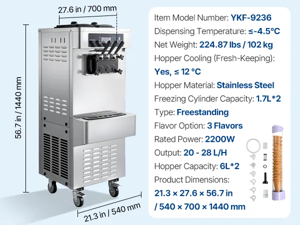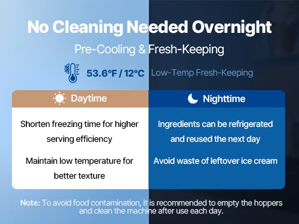 Vorkühlung für optimale Frische: Die freistehende Eismaschine produziert bis zu 20–28 L/h und liefert kontinuierlich 8–12 Portionen. Das Vorkühlsystem kühlt die Mischung auf max. 53,6 °F (12 °C) vor und sorgt so für dauerhafte Frische und verhindert Verderb, selbst bei hohen Umgebungstemperaturen oder bei Lagerung über Nacht