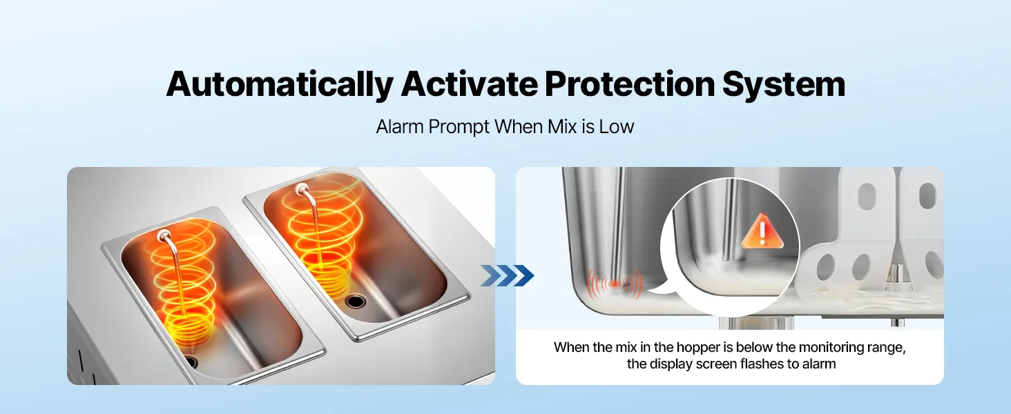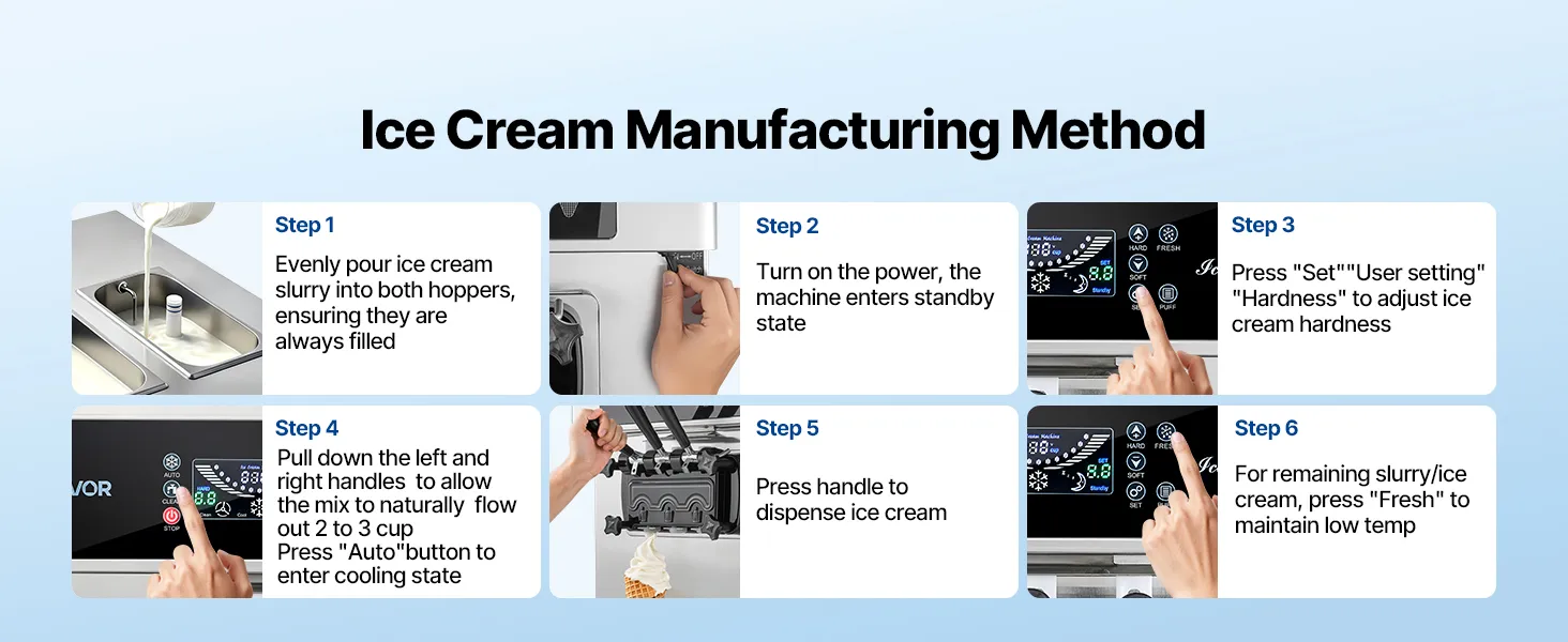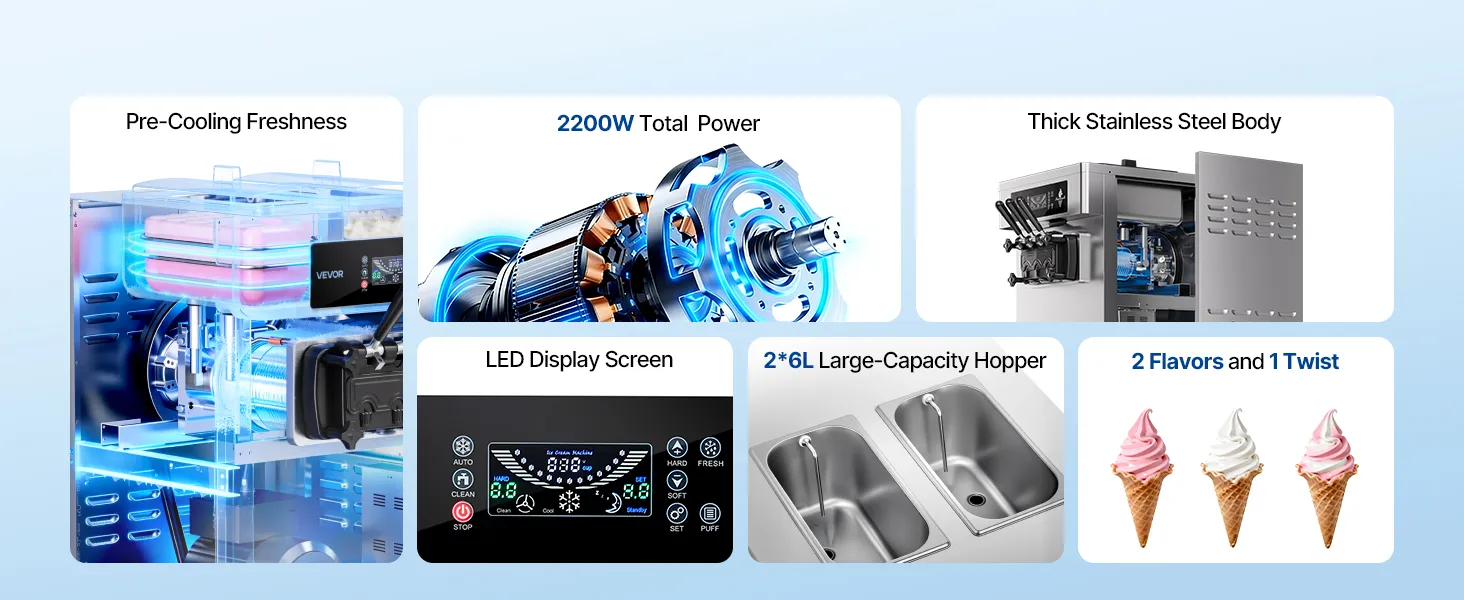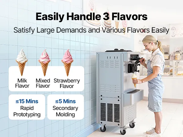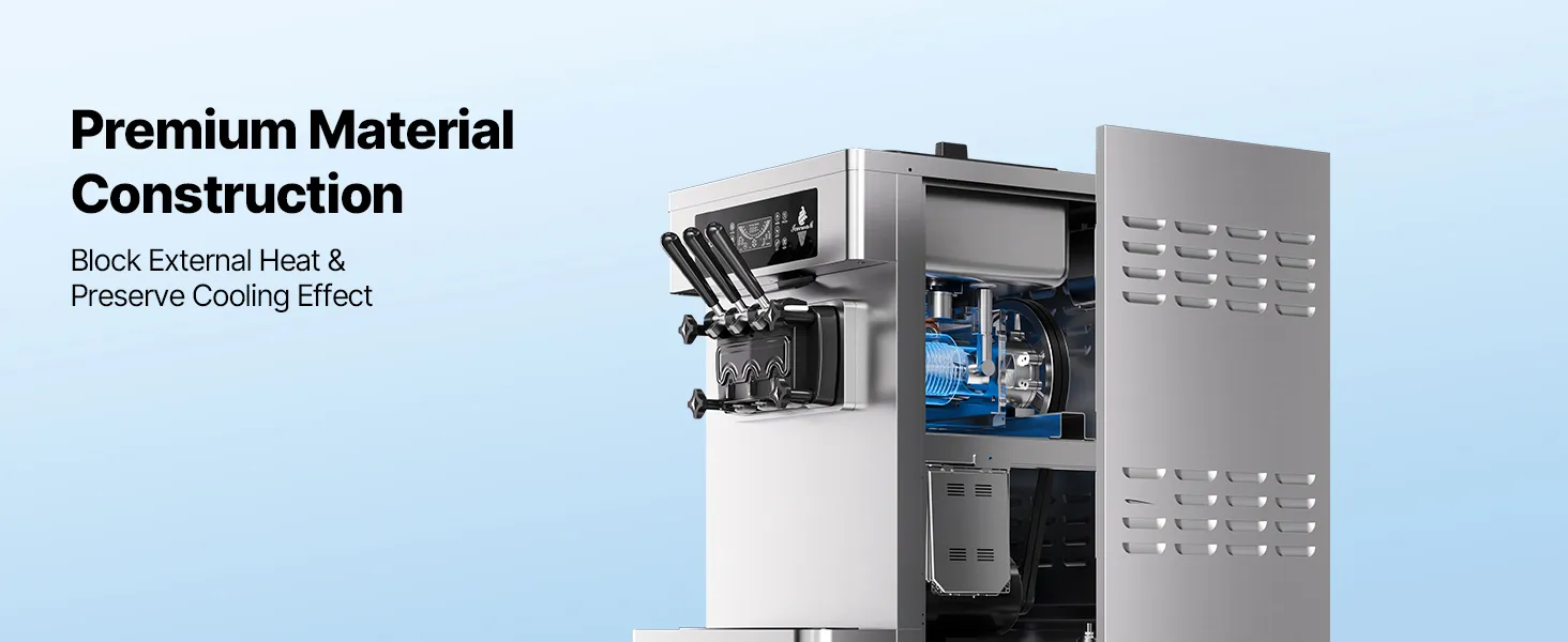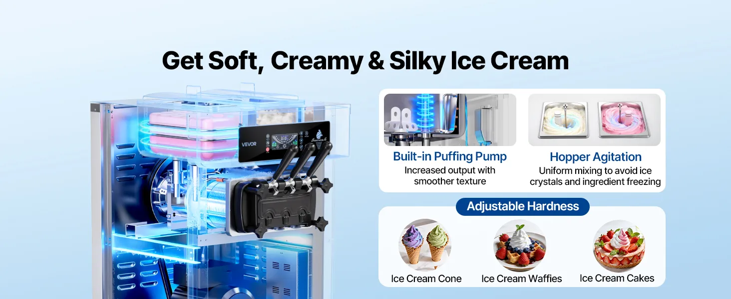 Die Gewerbeeismaschine produziert bis zu 20–28 L/h und kann drei Eissorten zubereiten. Dank Vorkühlung, integrierter Aufblaspumpe, Rührwerk im Behälter und Hochleistungskompressor gewährleistet sie eine gleichmäßige Eisausgabe mit feiner, homogener Konsistenz bei gleichzeitig effizienter Produktion.