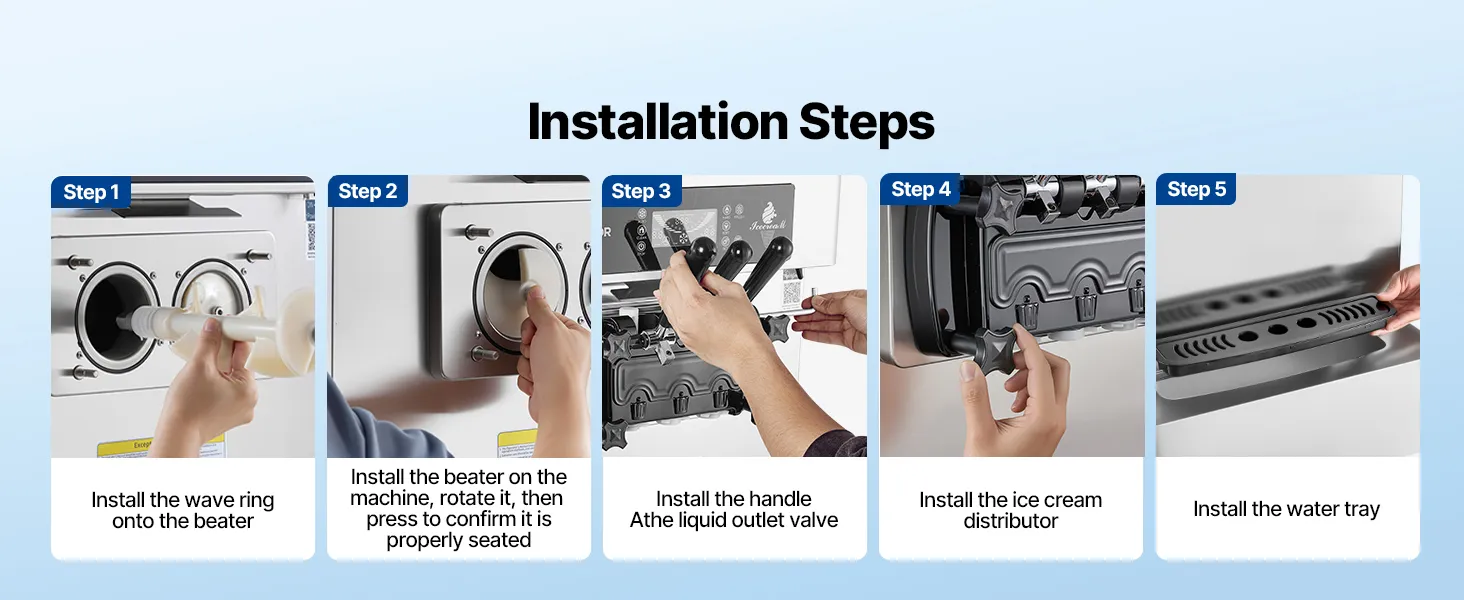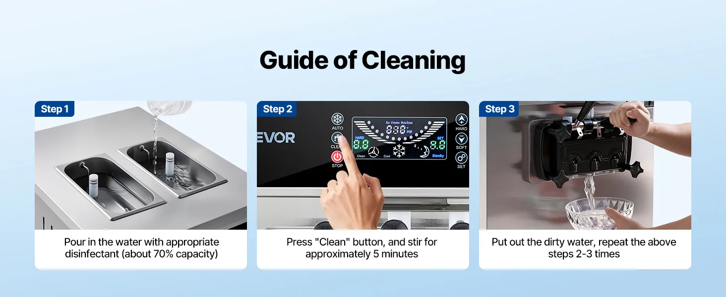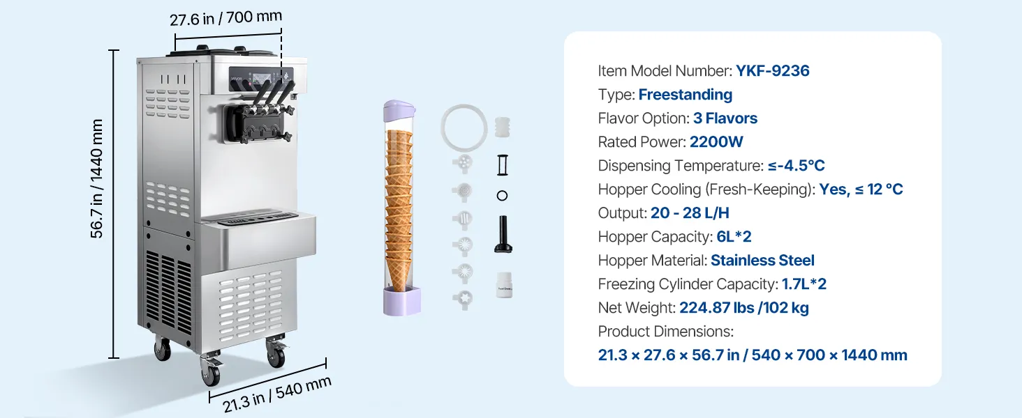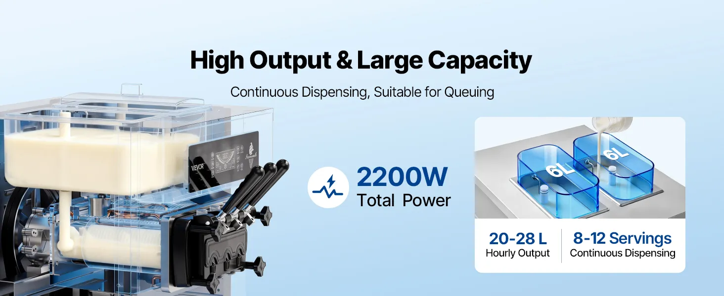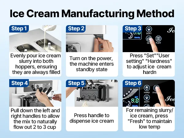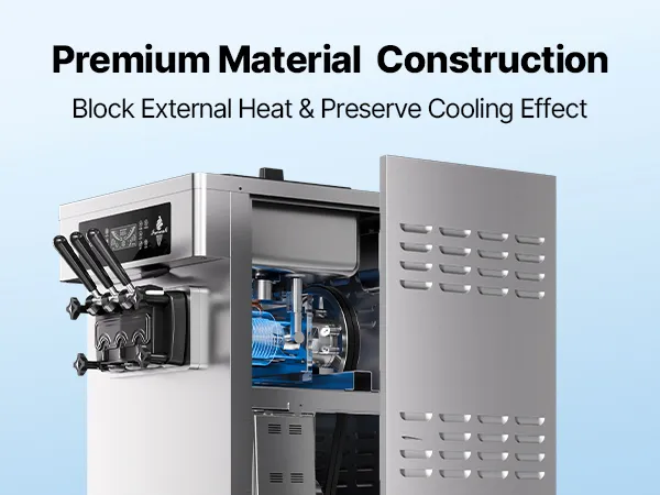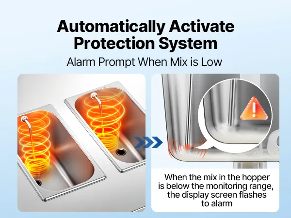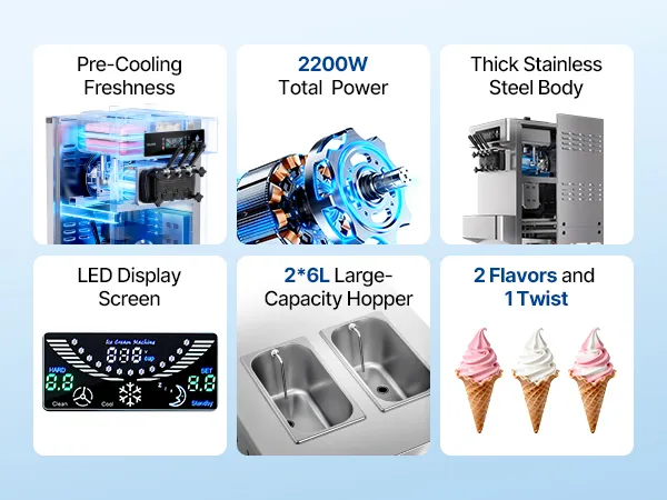 Die Gewerbeeismaschine produziert bis zu 20–28 L/h und kann drei Eissorten zubereiten. Dank Vorkühlung, integrierter Aufblaspumpe, Rührwerk im Behälter und Hochleistungskompressor gewährleistet sie eine gleichmäßige Eisausgabe mit feiner, homogener Konsistenz bei gleichzeitig effizienter Produktion.