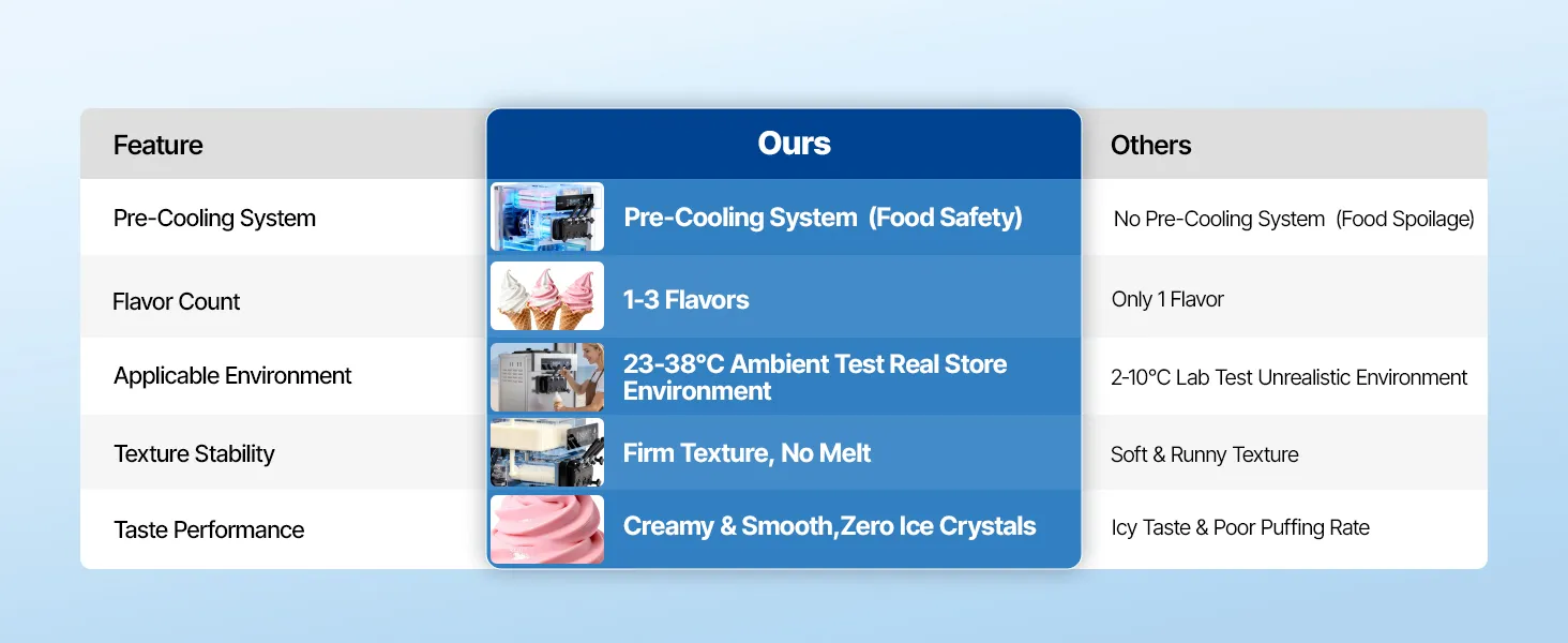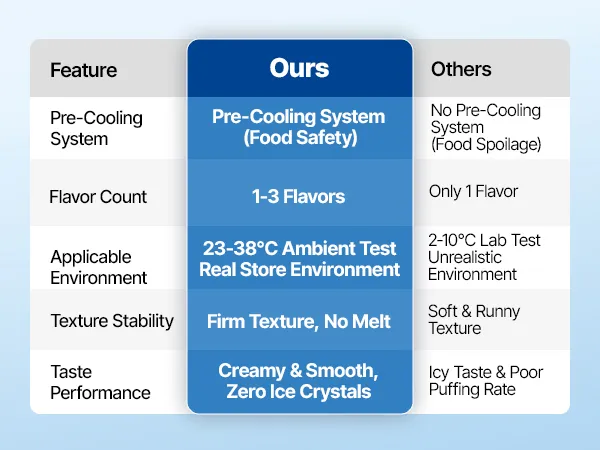 Verbesserte Aufpump- und Trichterbewegung: Im Vergleich zu herkömmlichen Aufschäumstangen (20–25 % Rate) erreicht unsere integrierte effiziente Aufschäumspumpe eine Aufschäumrate von 25–35 % und erhöht die Luftzufuhr, wodurch eine gleichmäßigere Dosierung und eine verbesserte Ausbeute gewährleistet werden. In Verbindung mit dem Rühren im Trichter sorgt dies für eine gleichmäßigere Konsistenz ohne Eiskristalle