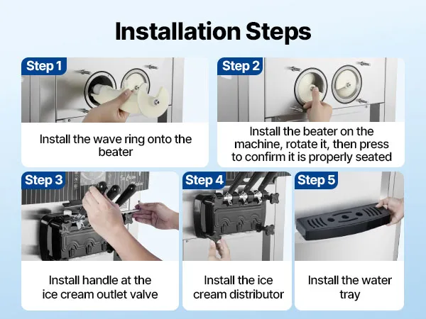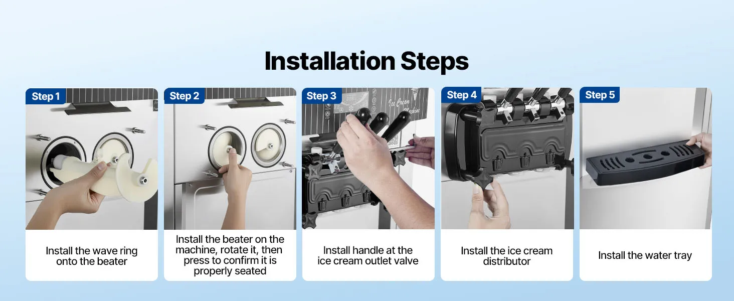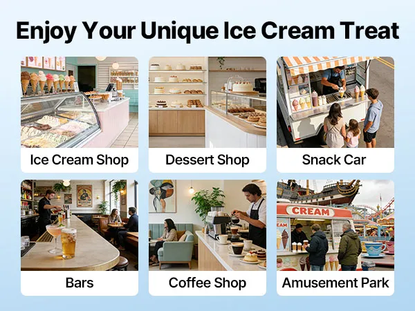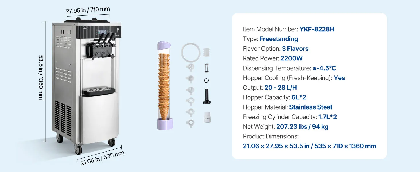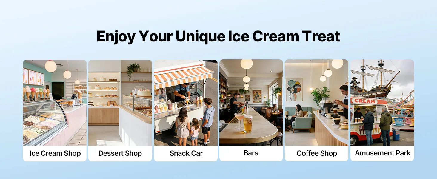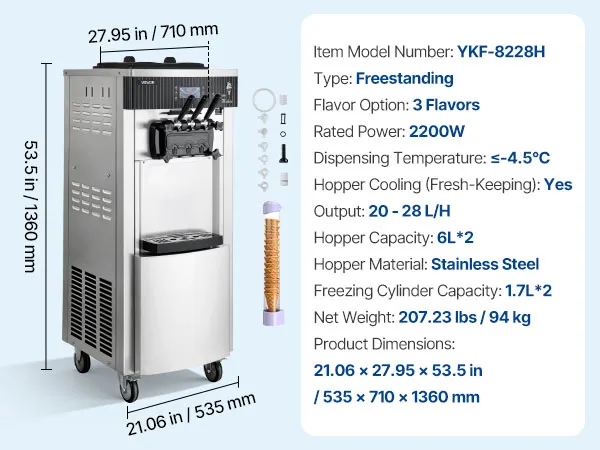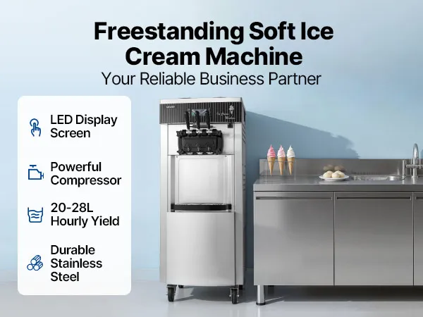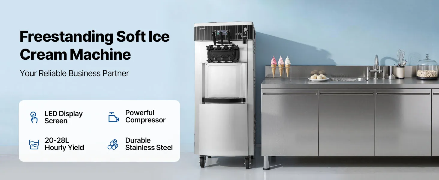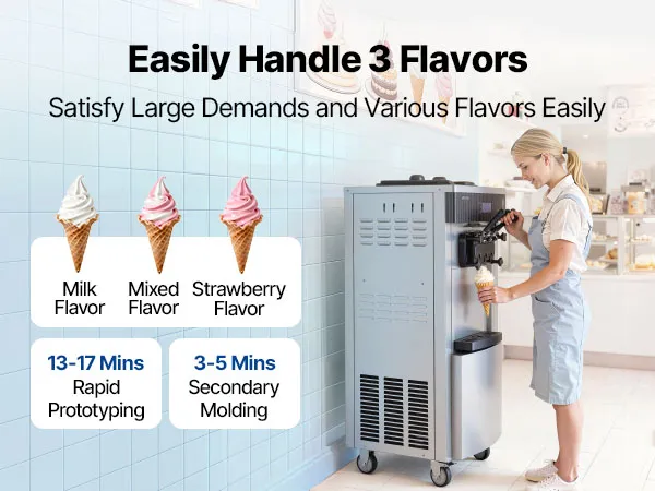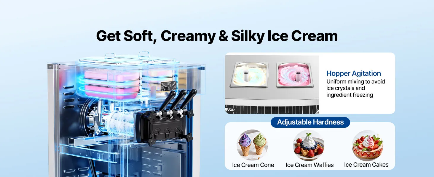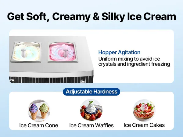 Die gewerbliche Eismaschine produziert bis zu 20–28 L/h und bietet drei Eissorten an. Mit Vorkühlung, Rührwerk im Behälter und Hochleistungskompressor ausgestattet, ermöglicht sie eine gleichmäßige Ausgabe mit feiner, homogener Konsistenz bei gleichzeitig effizienter Produktion.