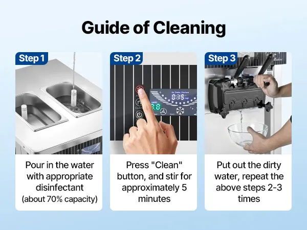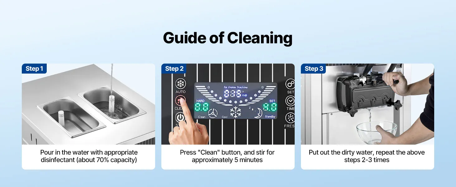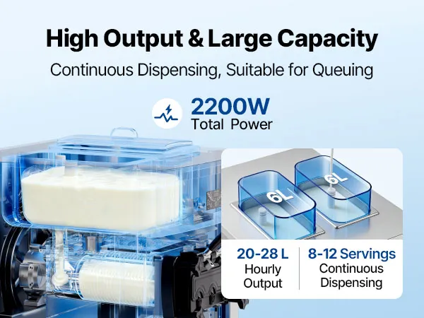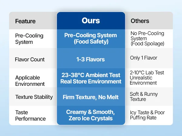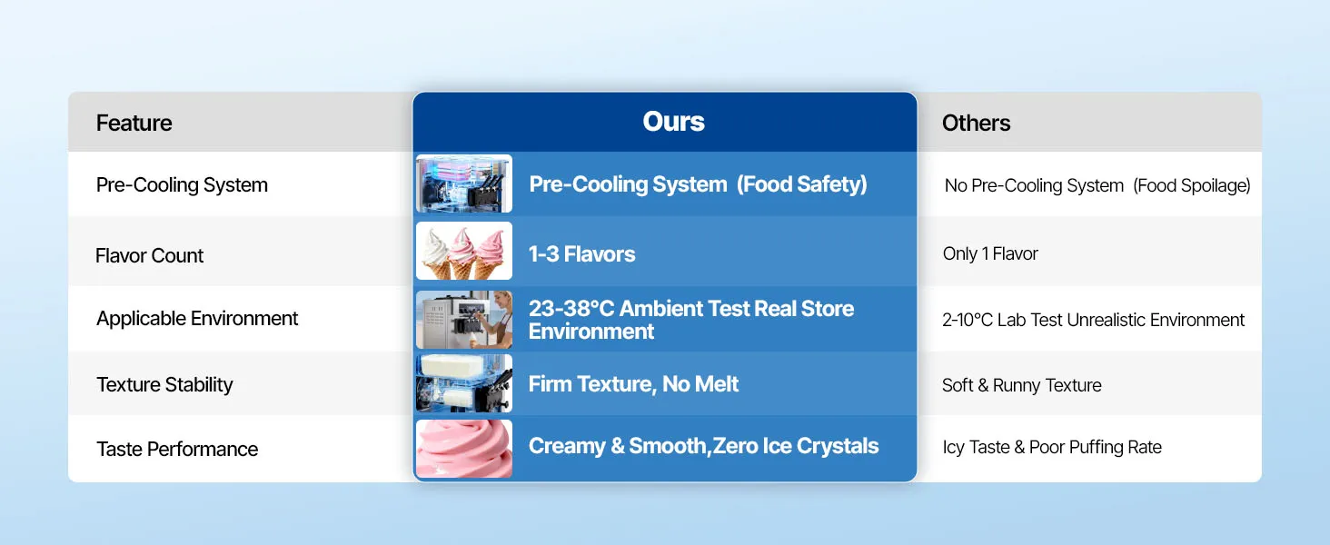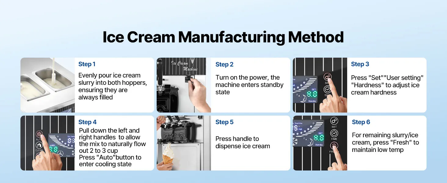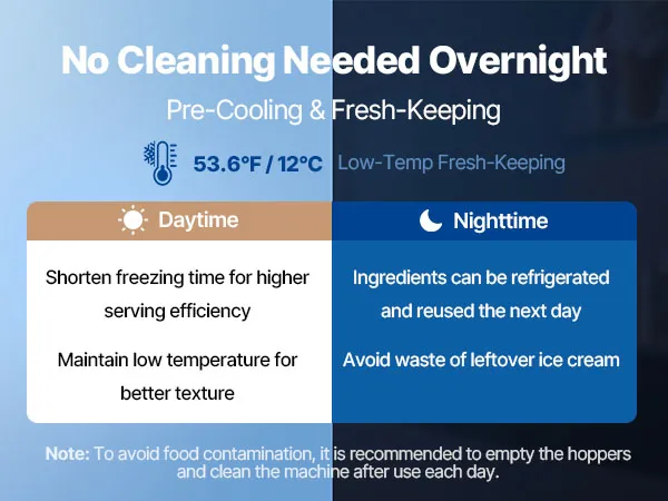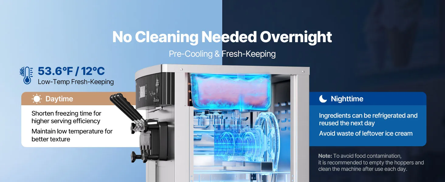 Vorkühlung für optimale Frische: Die freistehende Eismaschine produziert bis zu 20–28 L/h und liefert kontinuierlich 8–12 Portionen. Das Vorkühlsystem kühlt die Mischung auf max. 53,6 °F (12 °C) vor, trägt zur Frischeerhaltung bei und reduziert das Risiko von Verderb, selbst bei hohen Umgebungstemperaturen oder bei Lagerung über Nacht