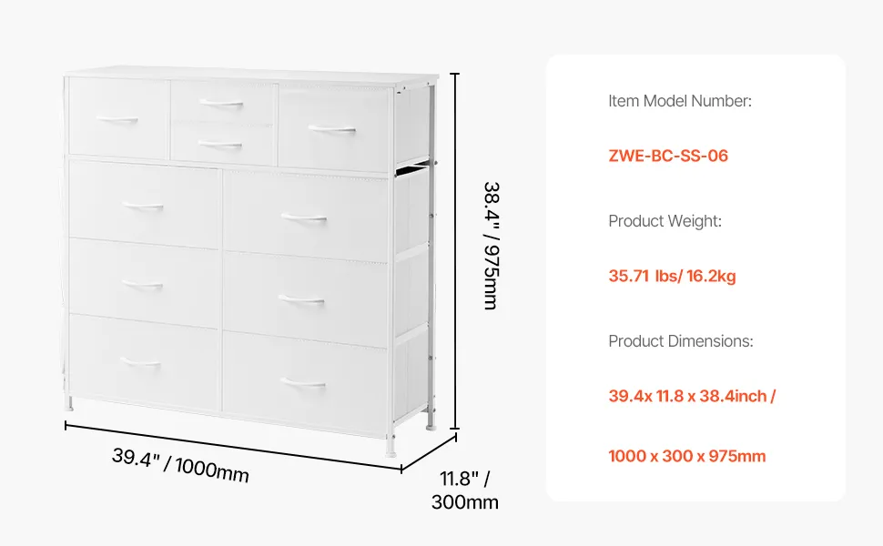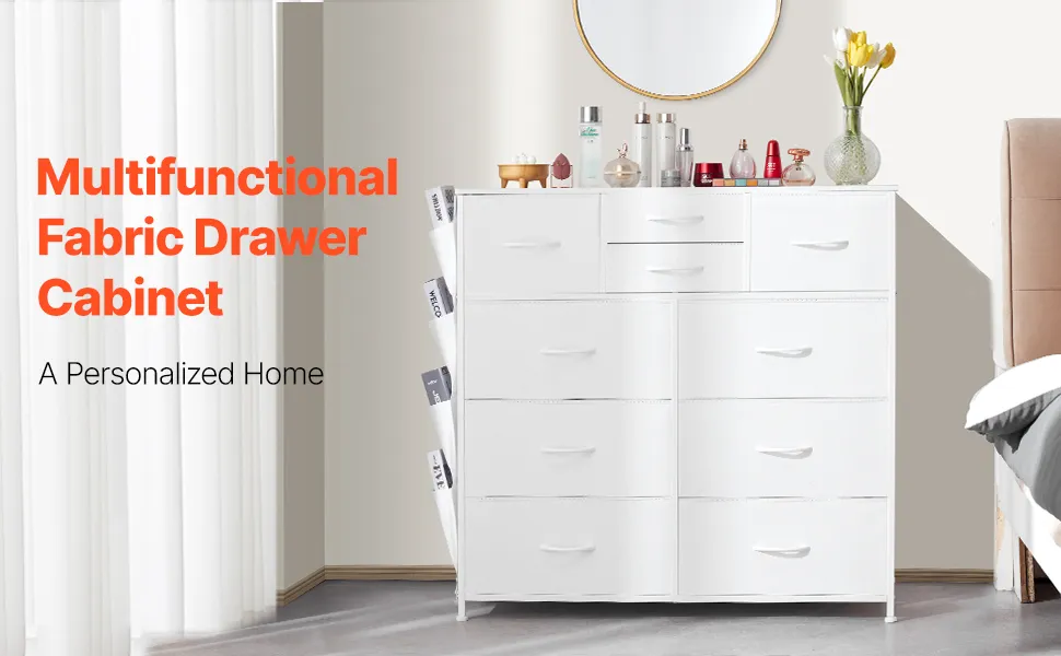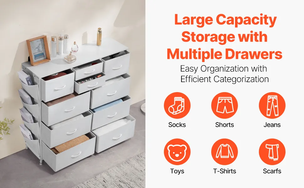 VEVOR Kommode mit 10 Schubladen, Stoffkommode mit Stoffbehältern, Schrankschubladen mit leicht zu ziehendem Griff & stabilem Stahlrahmen, Stoffaufbewahrungsturm für Schlafzimmer Flur Schrank Weiß