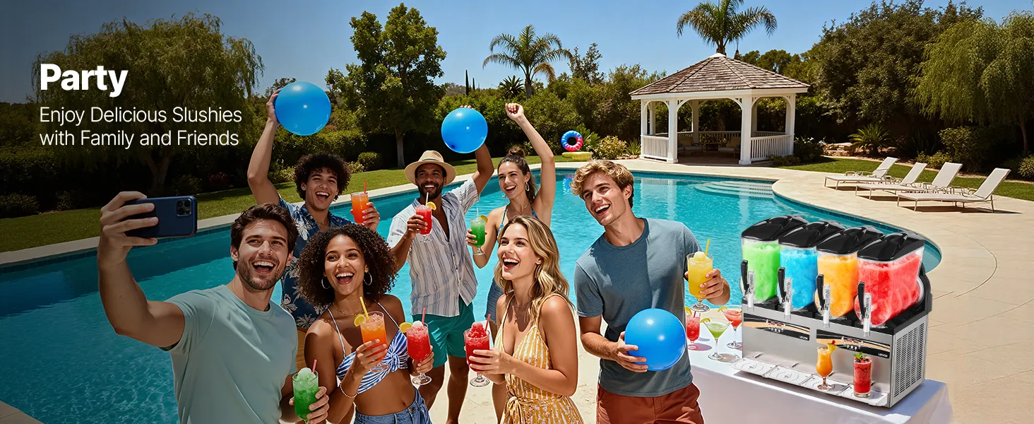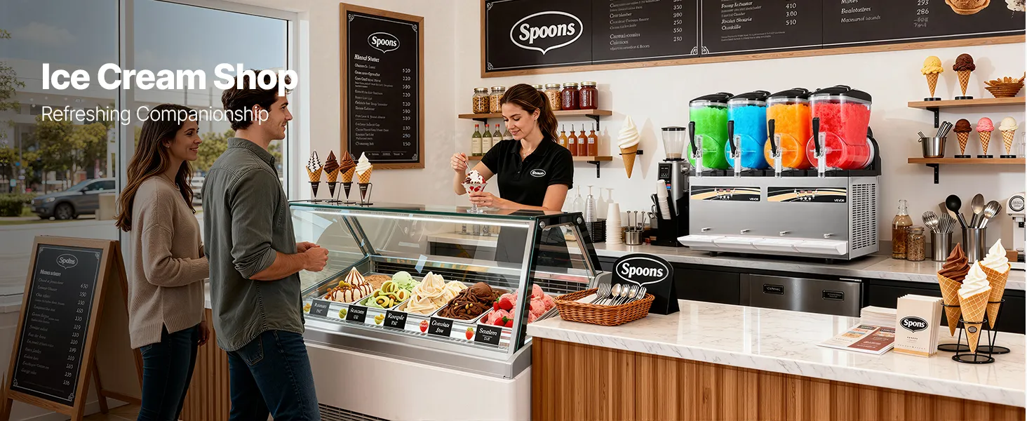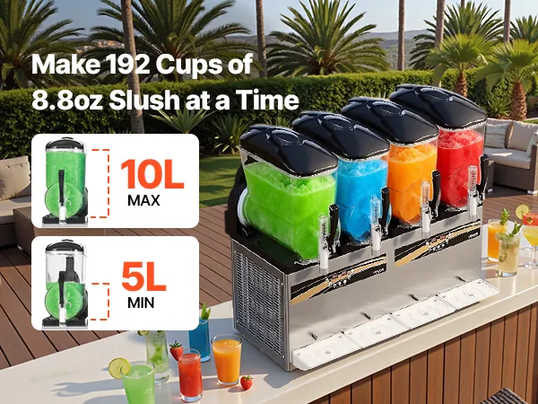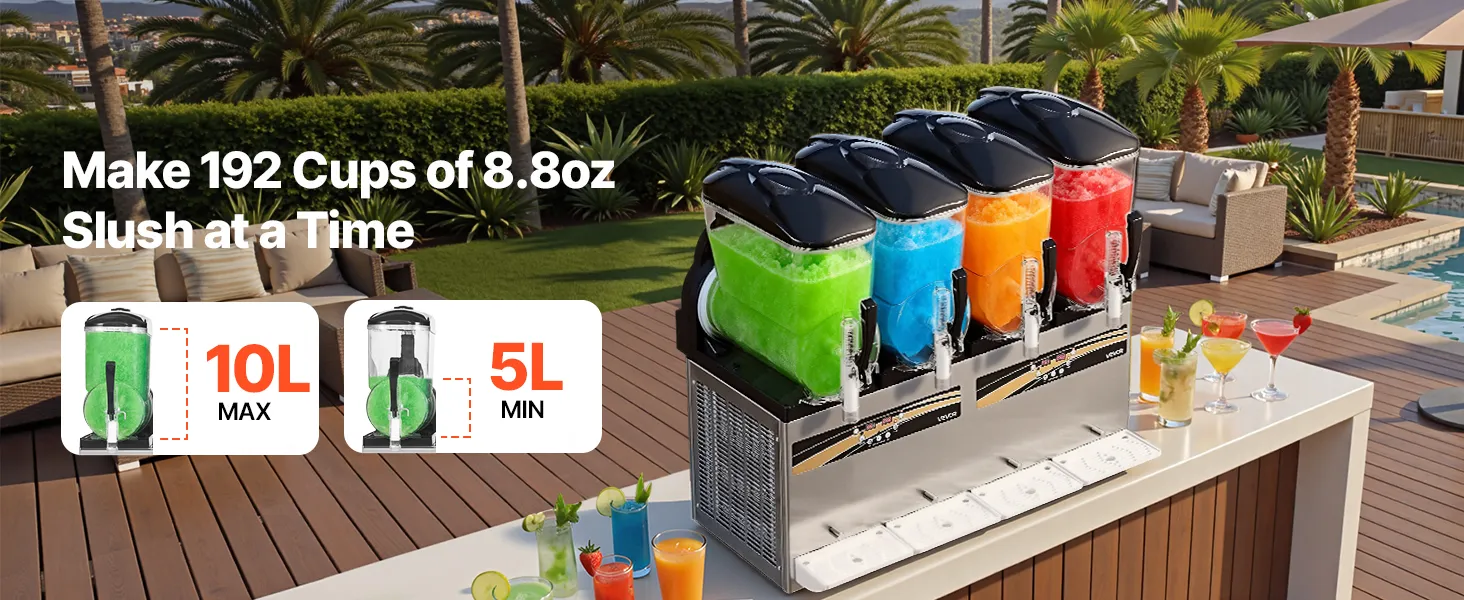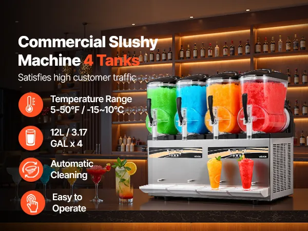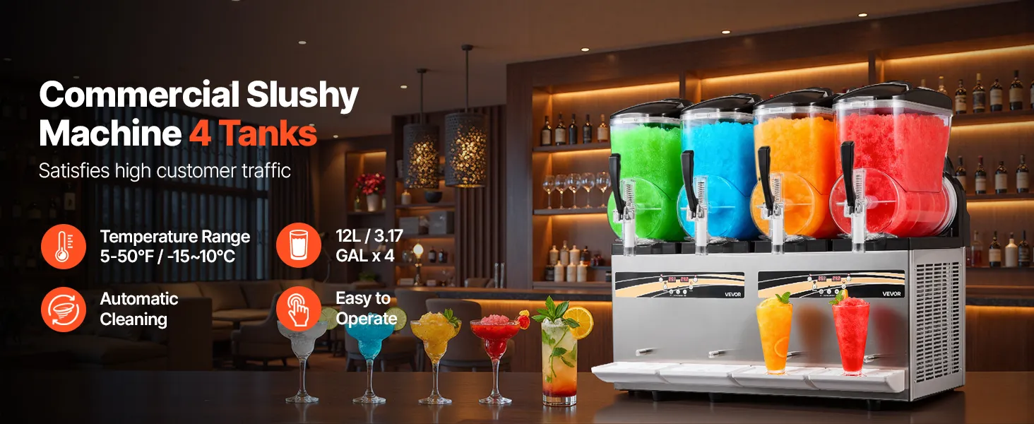 Diese professionelle Slush-Maschine verfügt über vier unabhängige 12 L Behälter (3,17 Gallonen) für die gleichzeitige Zubereitung mehrerer Geschmacksrichtungen. Konsistenz und Temperatur sind einstellbar; sie kühlt schnell, ist einfach zu bedienen und robust – ideal für stark frequentierte Cafés, Bars und Imbissstände, um erfrischende Eisgetränke anzubieten.