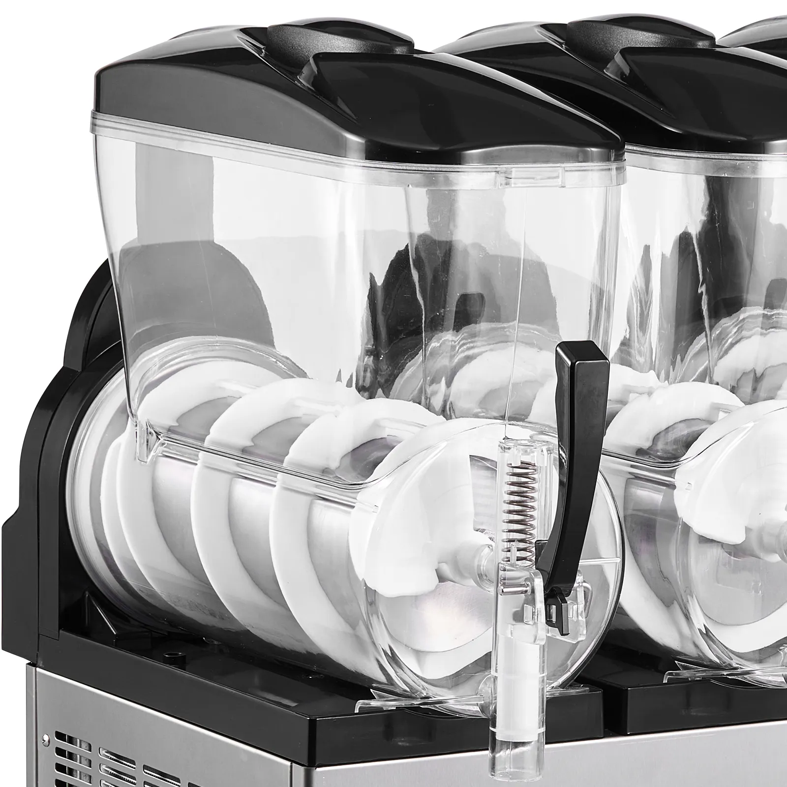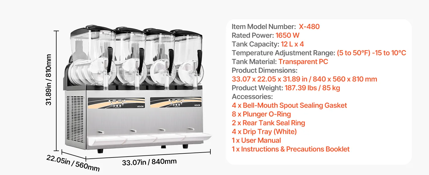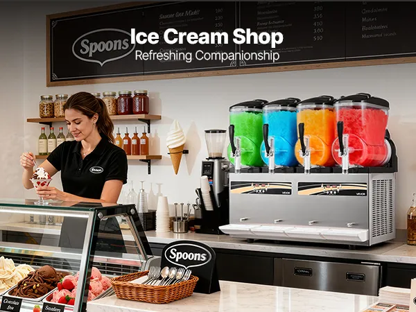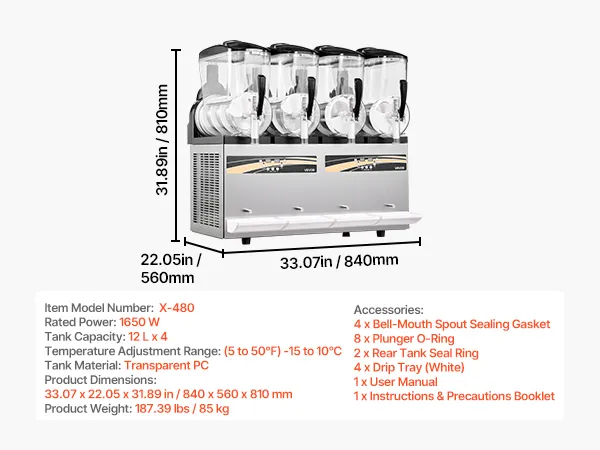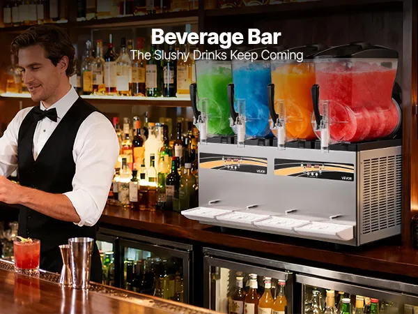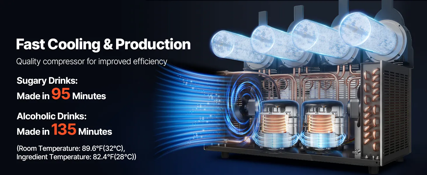 Diese professionelle Slush-Maschine verfügt über vier unabhängige 12 L Behälter (3,17 Gallonen) für die gleichzeitige Zubereitung mehrerer Geschmacksrichtungen. Konsistenz und Temperatur sind einstellbar; sie kühlt schnell, ist einfach zu bedienen und robust – ideal für stark frequentierte Cafés, Bars und Imbissstände, um erfrischende Eisgetränke anzubieten.