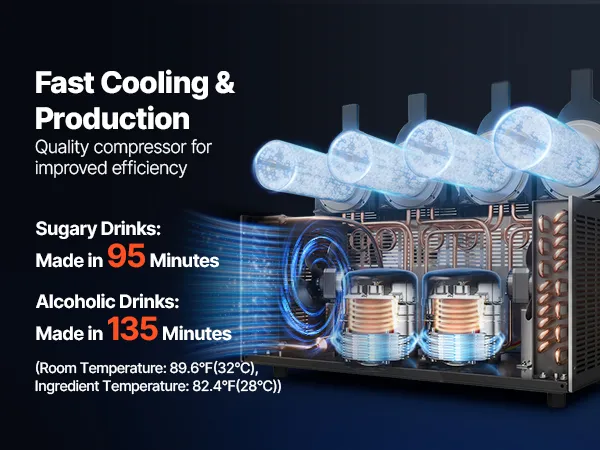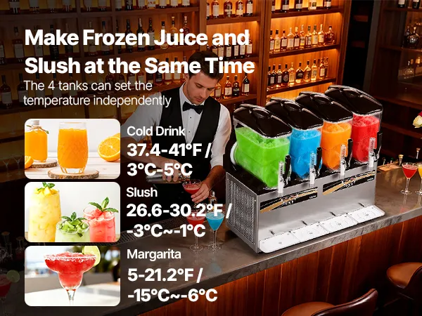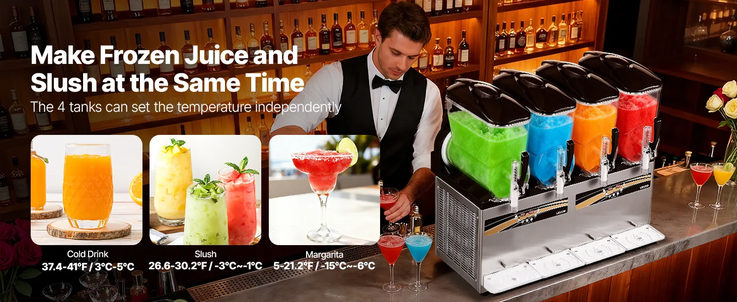 Für diverse Getränke: Diese verbesserte Slush-Maschine verfügt über einen einstellbaren Temperaturbereich von -15 bis 10 °C (5 bis 50 °F), sodass Sie den gewünschten Konsistenzgrad Ihrer Getränke individuell anpassen können. Für Kaltgetränke: 3 bis 5 °C (37,4 bis 41 °F); für alkoholfreie Slush-Eis-Getränke: -3 bis -1 °C (26,6 bis 30,2 °F); für alkoholische Getränke: -15 bis -6 °C (5 bis 21,2 °F). (Empfohlener Zuckergehalt: ca. 13 %, Alkoholgehalt: unter 13 %).