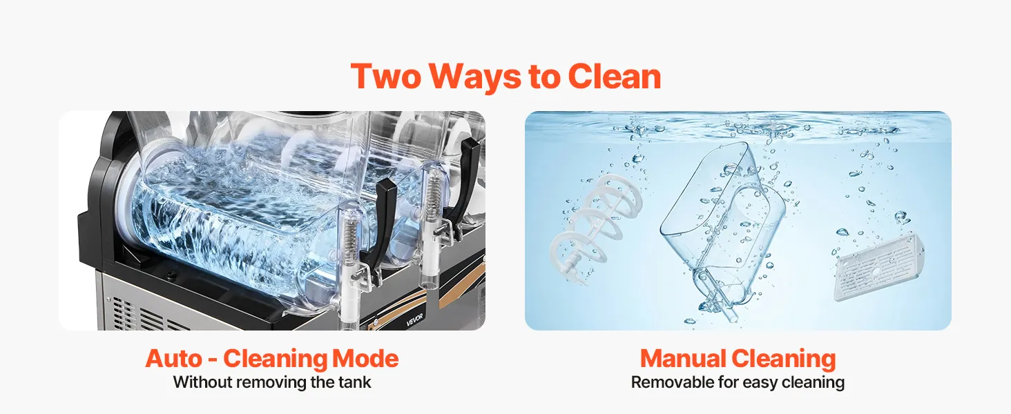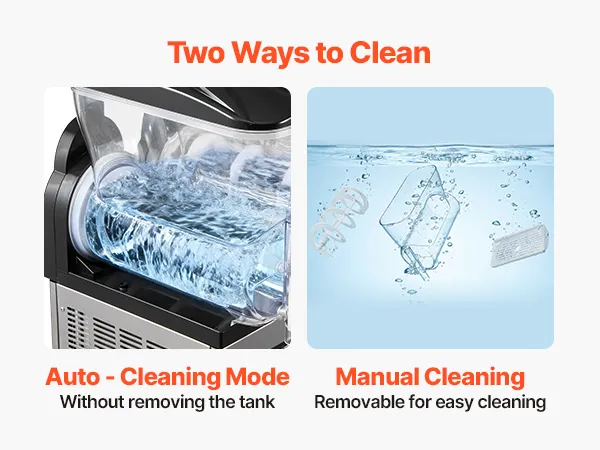 Langlebig & leicht zu reinigen: Dank des Edelstahlgehäuses und des lebensmittelechten Polycarbonat-Tanks ist diese Slusheis-Maschine für den gewerblichen Einsatz besonders langlebig und leicht zu reinigen. Der Tank verfügt über eine automatische Ein-Knopf-Reinigung, und die modularen Komponenten lassen sich werkzeuglos für eine problemlose Wartung und Reinigung demontieren