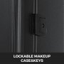Nahaufnahme des Schlosses und der Schlüssel des rollenden Kosmetikkoffers von VEVOR auf einer glatten schwarzen Oberfläche.