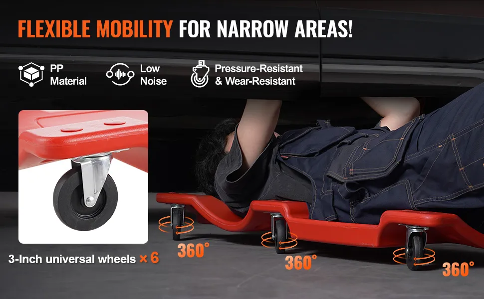 Dank der geringen Bodenfreiheit und der sechs Lenkrollen können Sie sich mit diesem Rollbrett mühelos unter Fahrzeugen bewegen. Gleiten Sie mühelos von einer Seite zur anderen oder vorwärts und rückwärts, ohne sich mühsam neu positionieren zu müssen.
