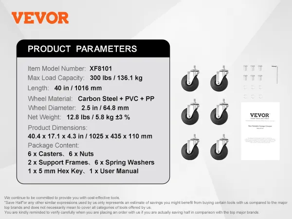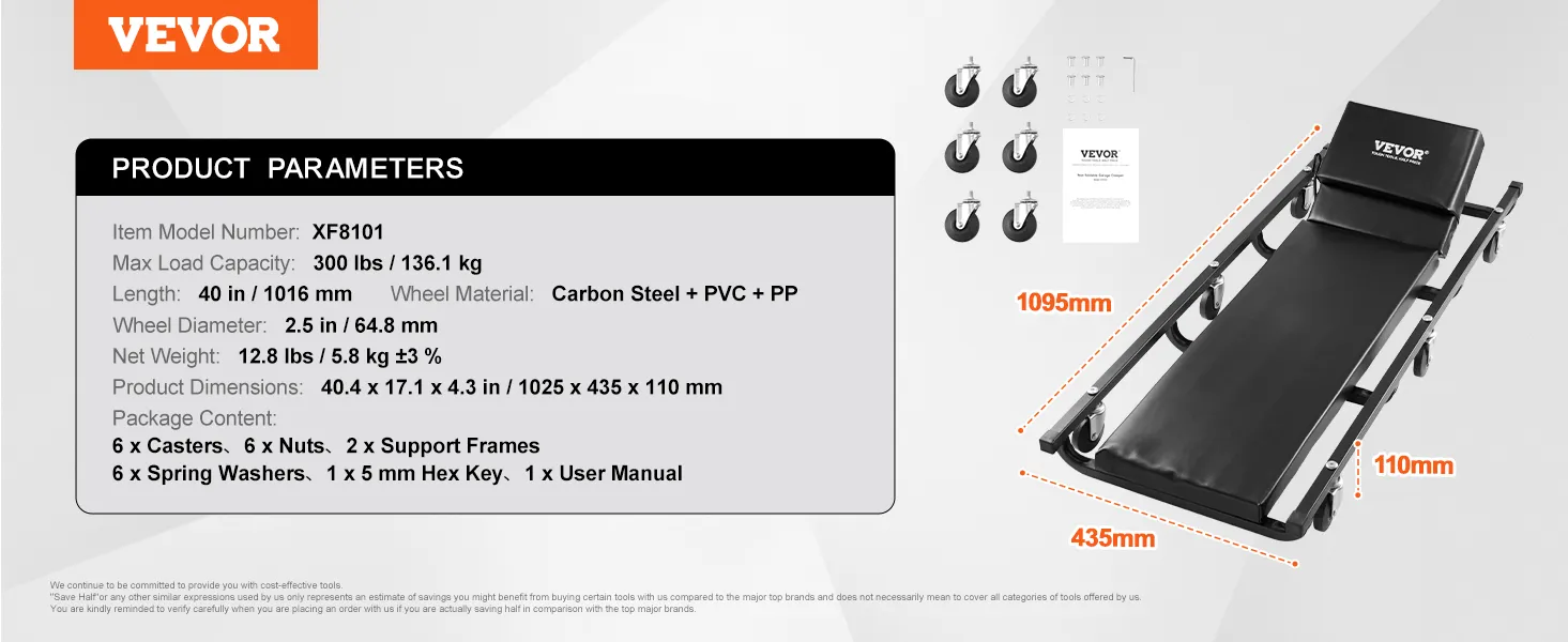VEVOR Assembly Creeper Workshop Creeper, 1016 mm, 136 kg Load Capacity Creeper for Mechanics, for Motor Vehicles with 6 Swivel Casters, Adjustable, Padded Headrest, Workshop Creeper Garage