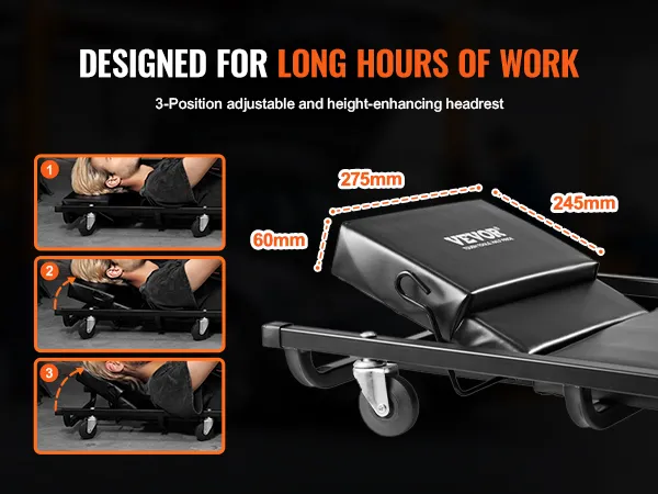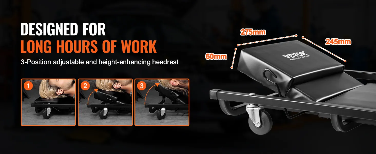 Triple-adjustable headrest: The headrest and shoulder pads can be adjusted to three height positions. The headrest can be raised up to 2.4 inches (6.1 cm), providing maximum comfort and effective relief for the head, neck, and spine. Ideal for working or resting under vehicles with high ground clearance, such as trucks.