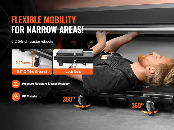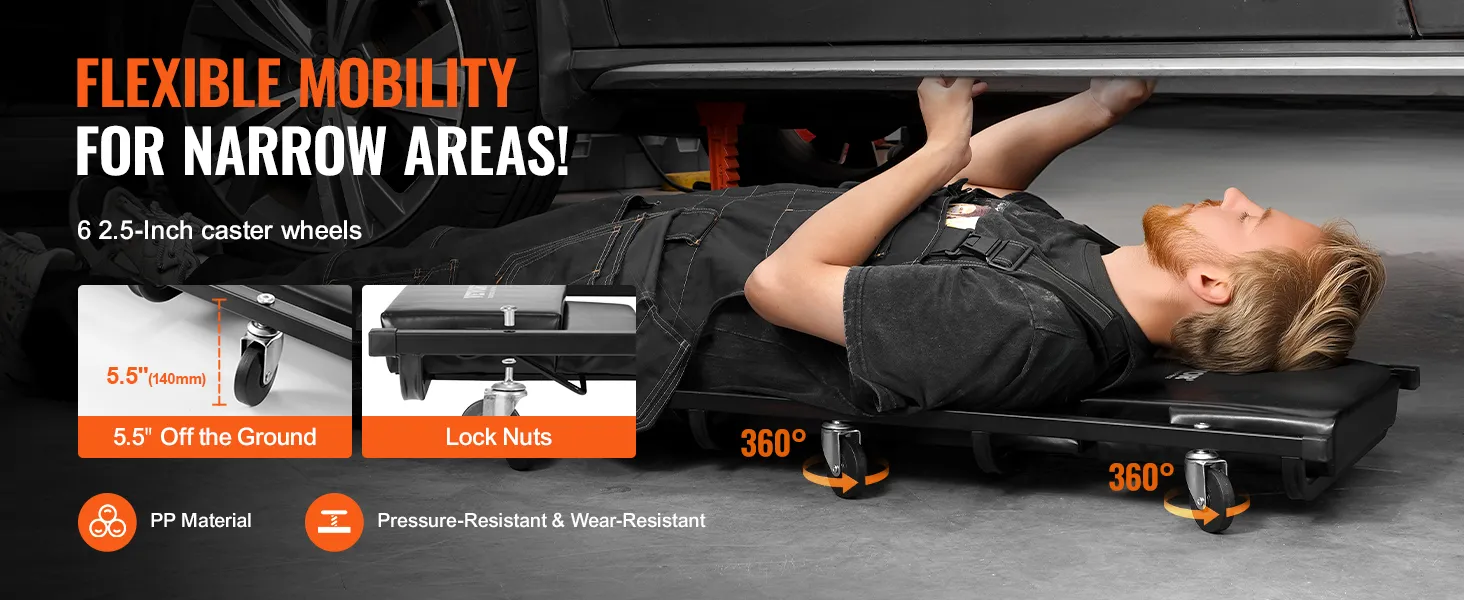 Achieve more with ease: With a ground clearance of just 4.3 inches (10.92 cm), this mechanic's trolley effortlessly reaches tight and low spaces. It's ideal for car repairs and inspections, making it suitable for use in garages, repair shops, and even DIY projects.