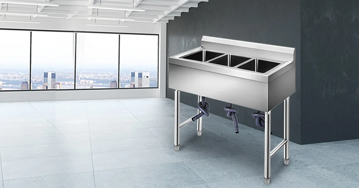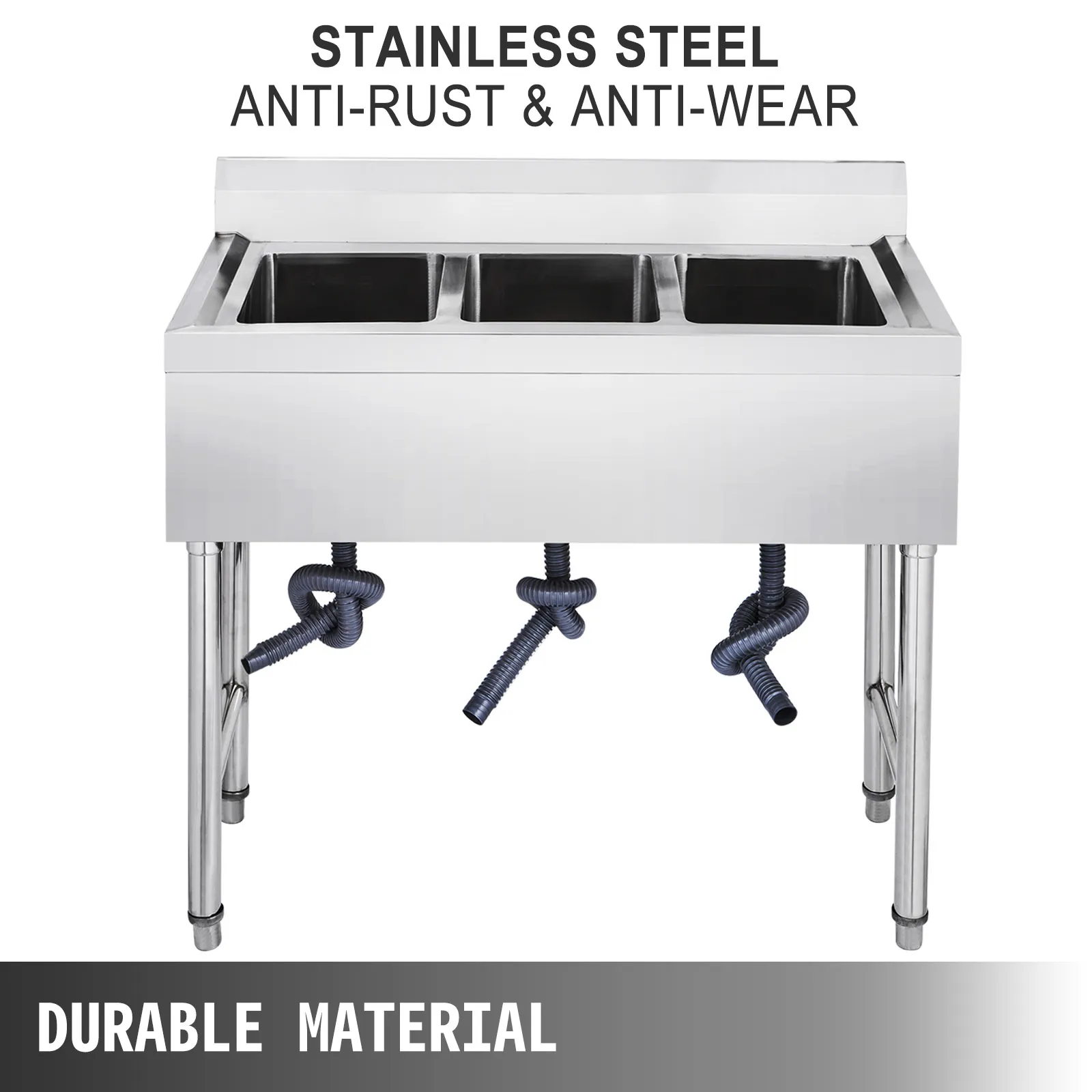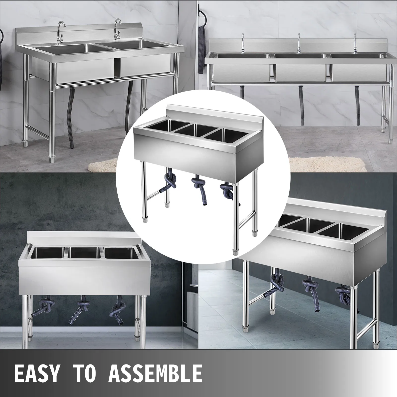 Mit 3 tiefen Spülbecken in diesem Edelstahlspülbecken mit Beinen können es mehrere Personen gleichzeitig benutzen.